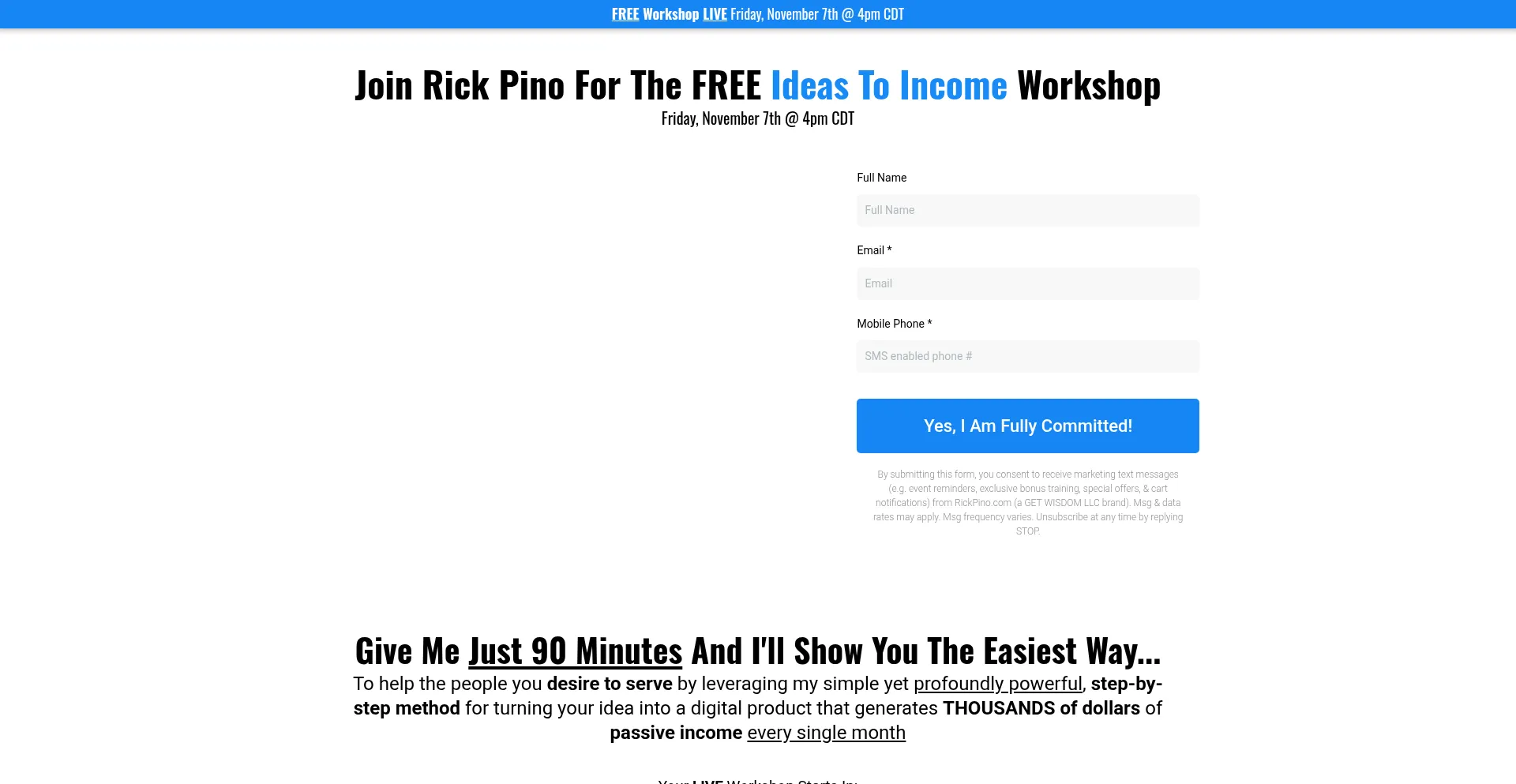 该网站实现数据收集表单,请求个人信息,包括姓名、电子邮件地址、电话号码或其他敏感详细信息。用户应验证 ideatoincomeworkshop.com 的合法性并在提交个人数据前查看隐私政策。