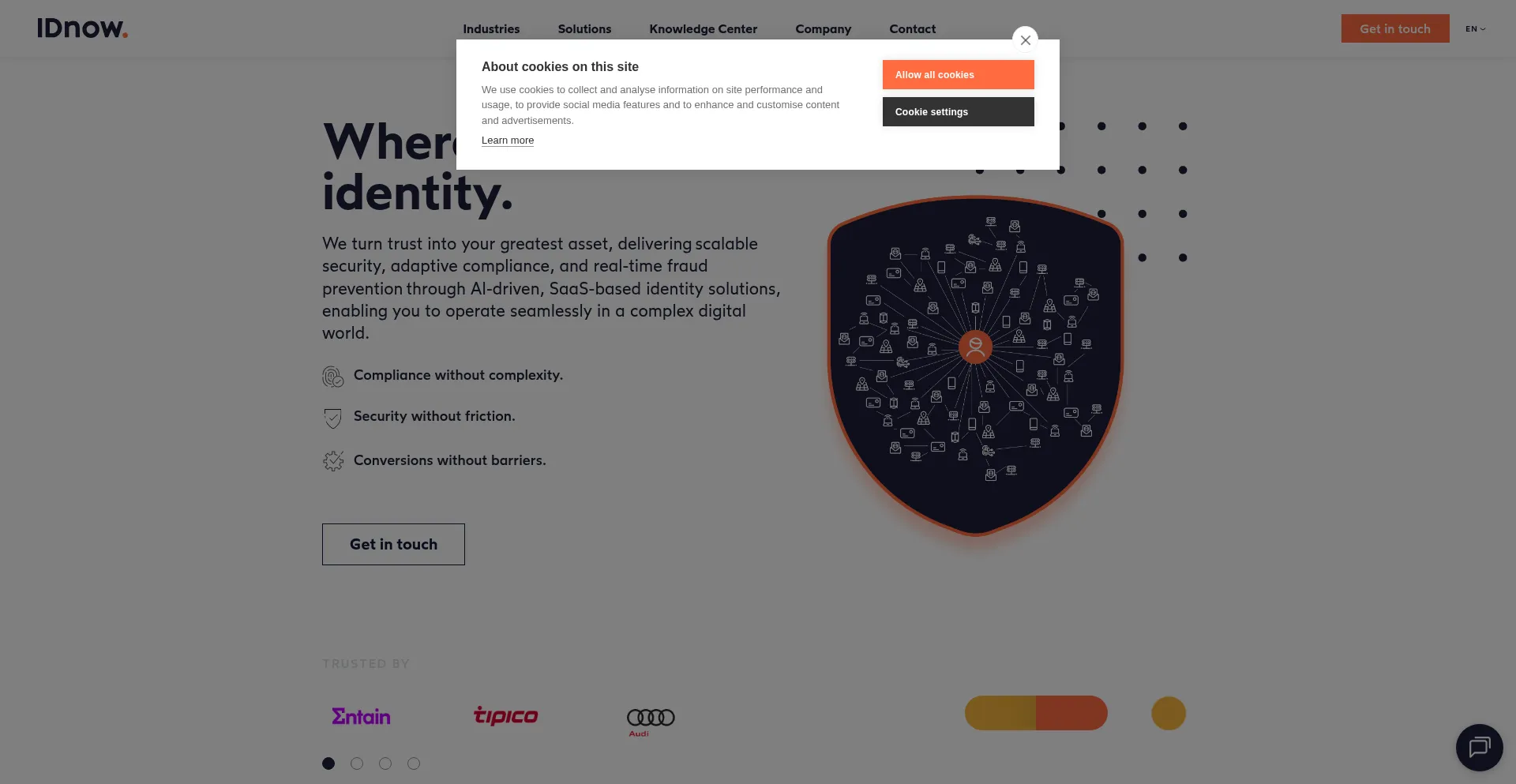 该网站实现符合GDPR或CCPA等隐私法规的cookie同意机制。这表明 idnow.io 遵守数据保护标准并为用户提供对个人数据收集实践的控制。
