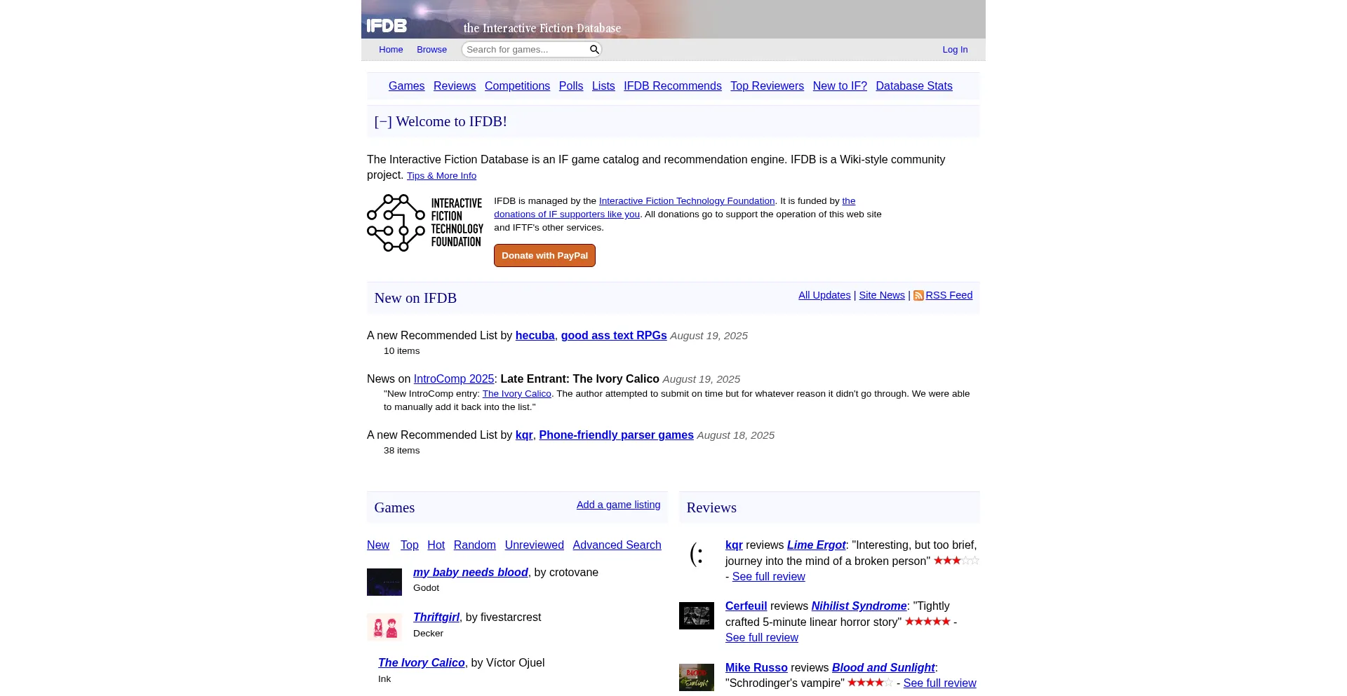 IFDB is a game catalog and recommendation engine for Interactive Fiction, also known as Text Adventures. IFDB is a collaborative, wiki-style community project. Members can cont...
