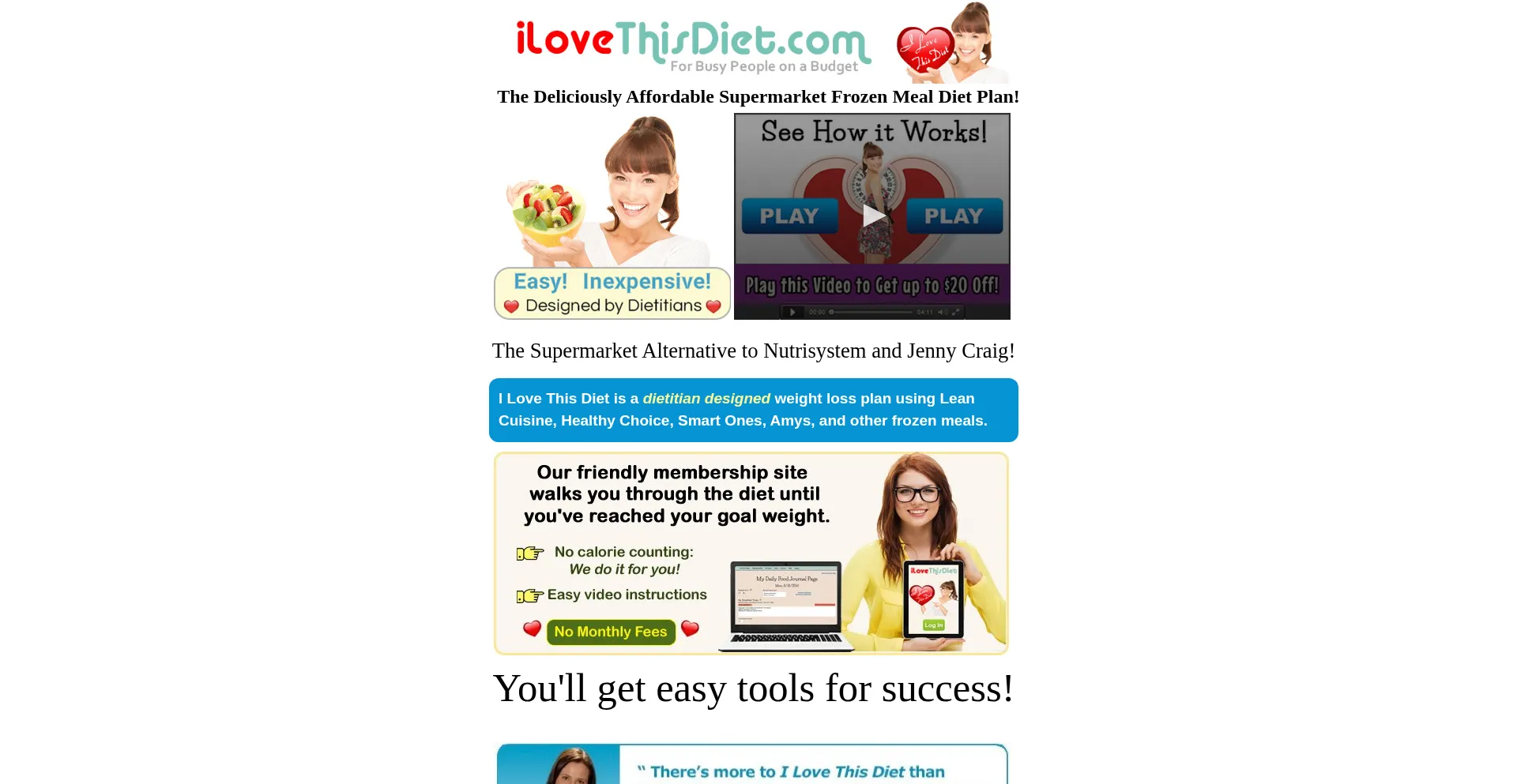 I Love This Diet is the affordable and effective weight loss plan designed by dietitians using specially-chosen, healthy frozen meals from the supermarket.