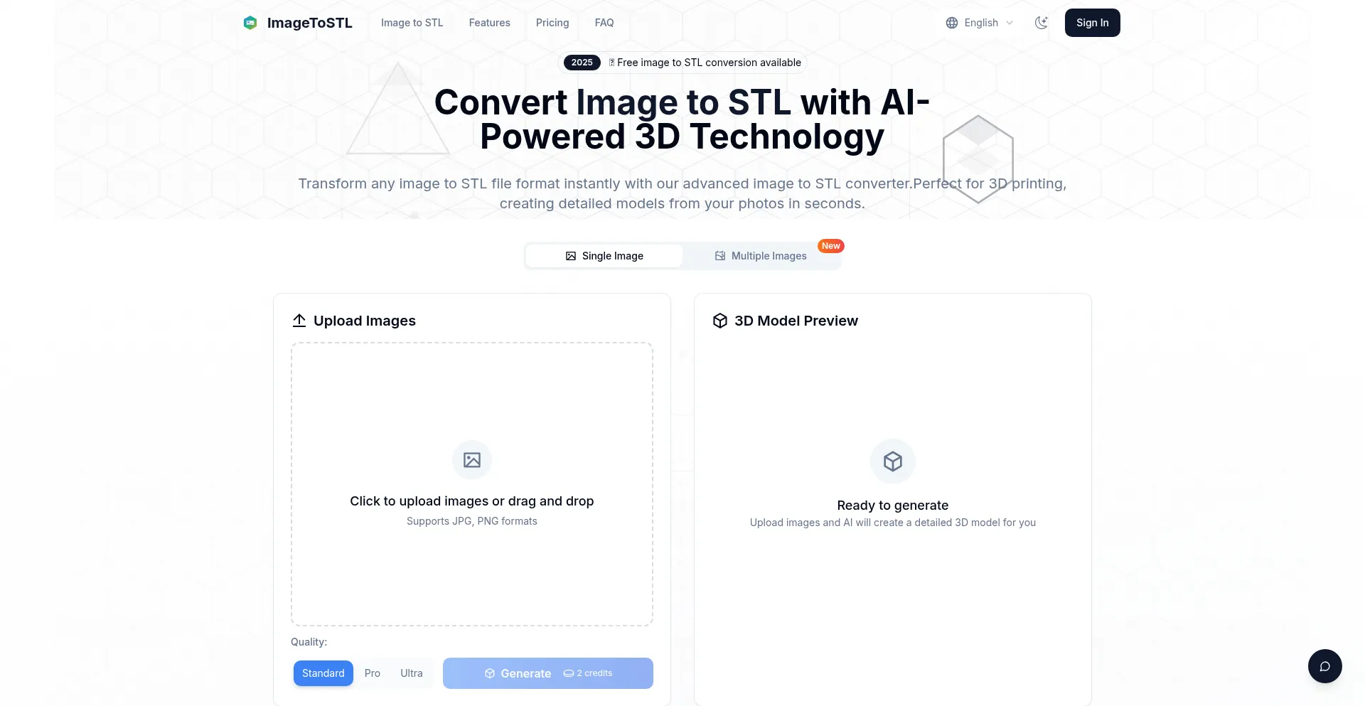 Free Convert image to STL files instantly with AI. Transform PNG, JPG photos into 3D printable STL models for free. Best image to STL converter online.