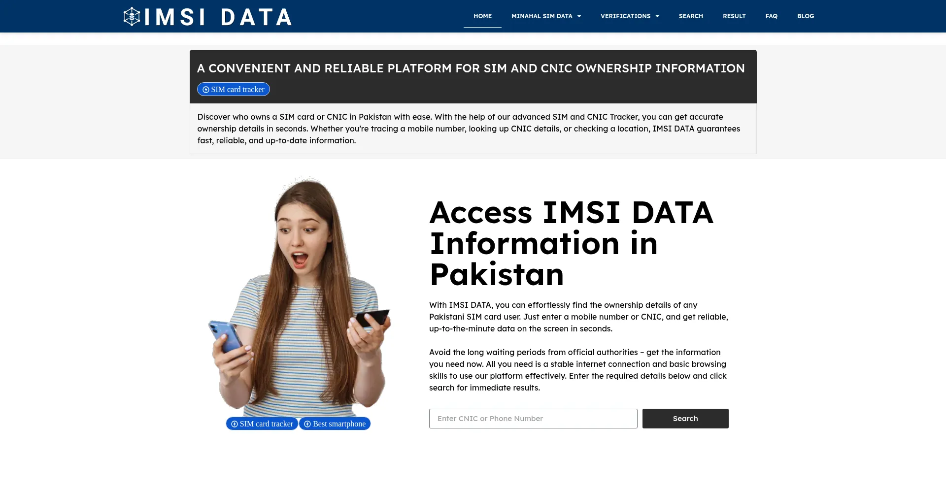 Quickly find SIM and CNIC ownership details in Pakistan with IMSI DATA. Enter mobile number or CNIC for accurate, instant results—all free and reliable!