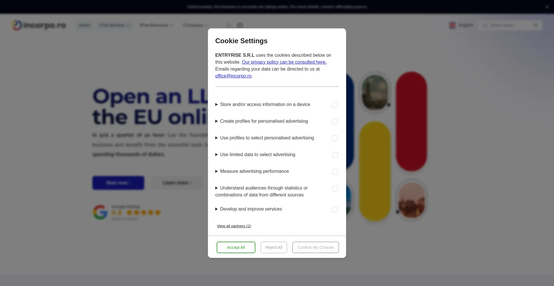 该网站实现数据收集表单,请求个人信息,包括姓名、电子邮件地址、电话号码或其他敏感详细信息。用户应验证 incorpo.ro 的合法性并在提交个人数据前查看隐私政策。