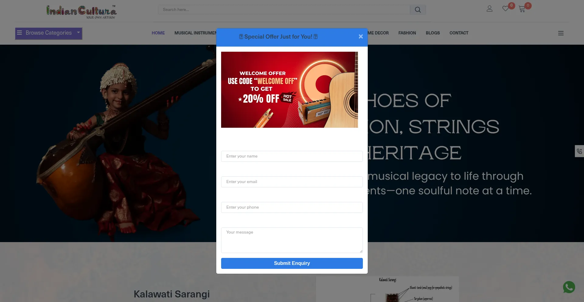 该网站实现数据收集表单,请求个人信息,包括姓名、电子邮件地址、电话号码或其他敏感详细信息。用户应验证 indiancultura.com 的合法性并在提交个人数据前查看隐私政策。