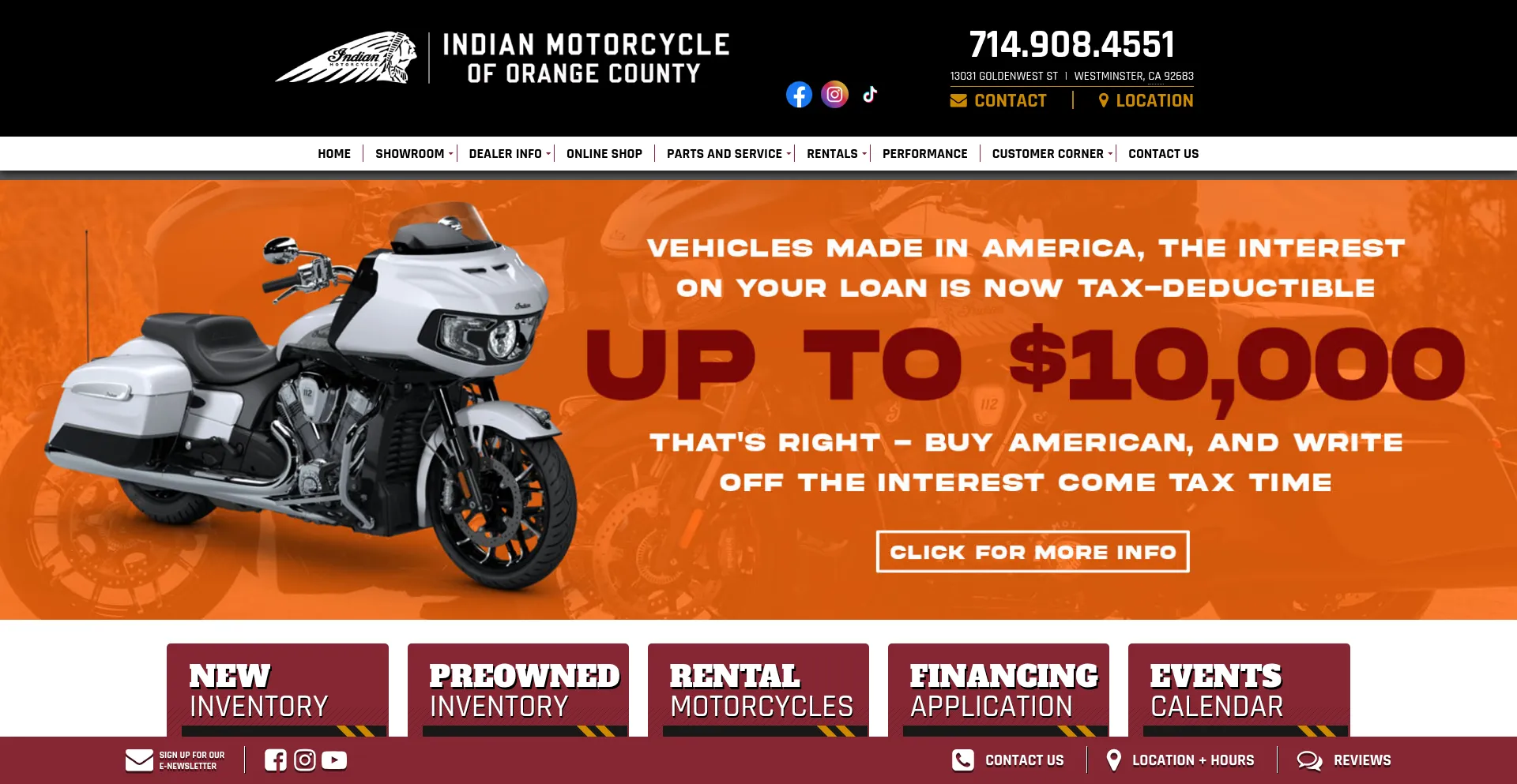 Indian ® Motorcycle of Orange County is a certified Indian® motorcycle dealer in Orange County, CA. We also offer parts, service, and financing. Come visit us today!