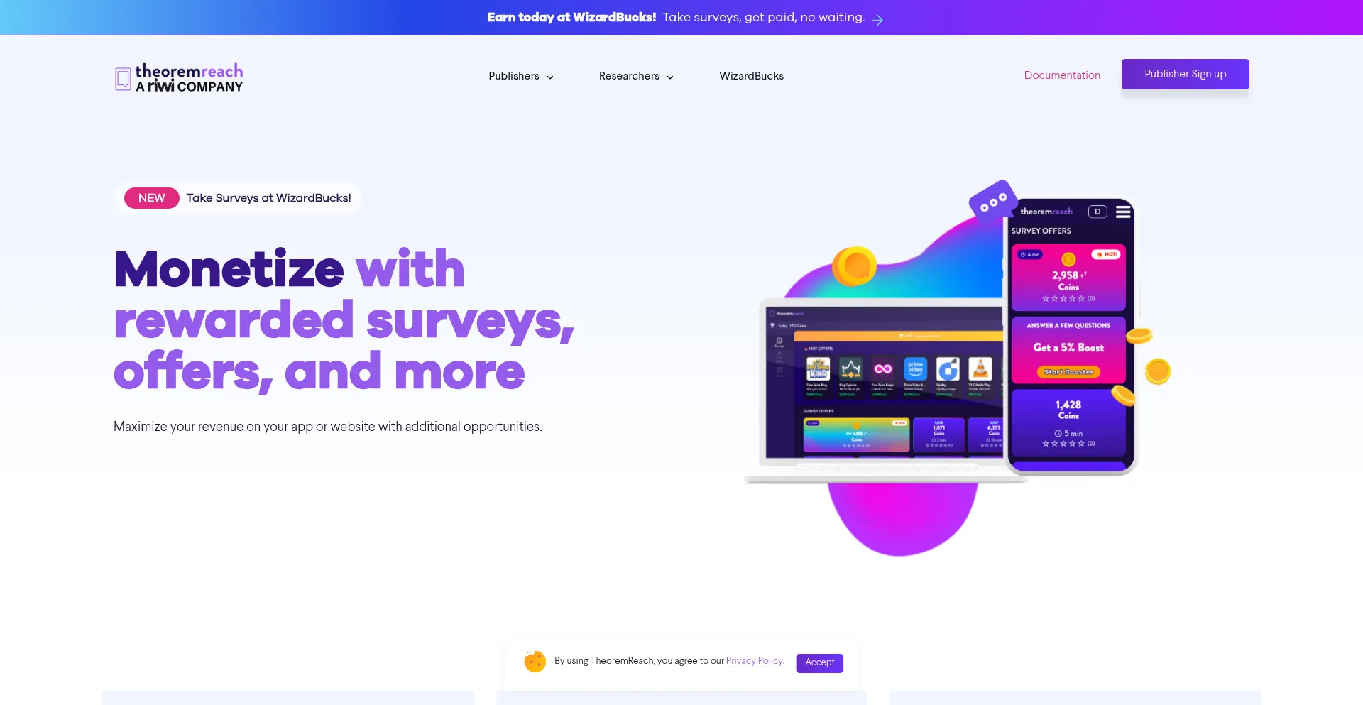 TheoremReach makes it easy for you to earn revenue by adding fun, rewarded surveys and offers to your website or mobile app.