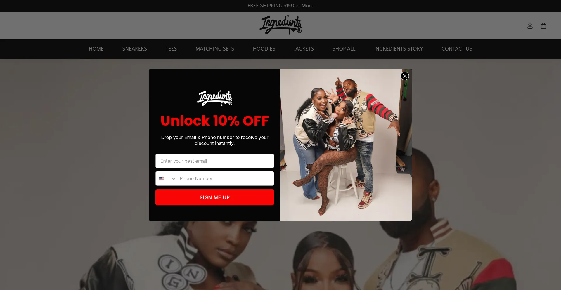 该网站实现数据收集表单,请求个人信息,包括姓名、电子邮件地址、电话号码或其他敏感详细信息。用户应验证 ingredientsclothingco.com 的合法性并在提交个人数据前查看隐私政策。