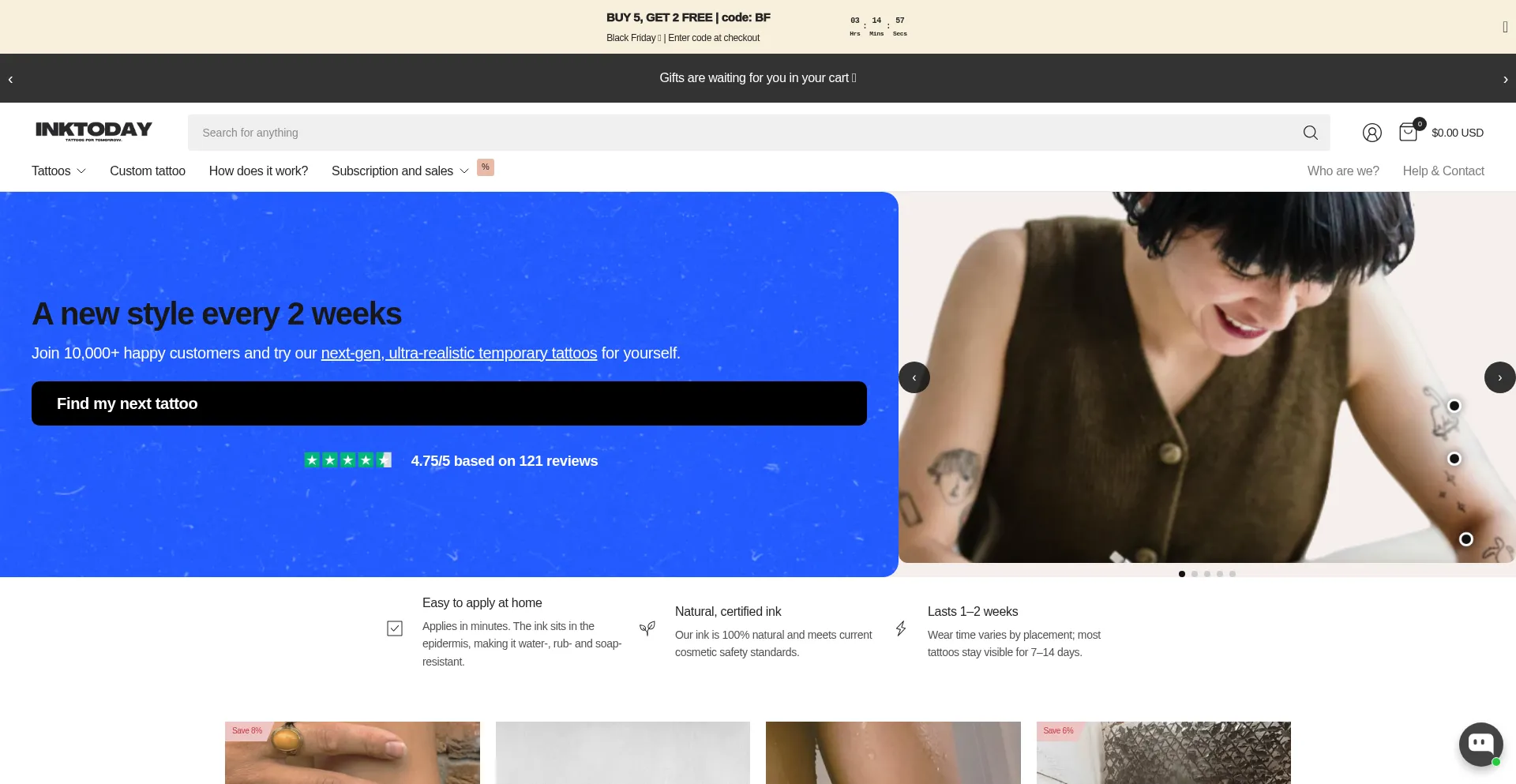 Discover InkToday, temporary tattoos that fade naturally in 2 weeks. 100% vegan, waterproof and easy to apply, for a stylish and reinvented look at will.