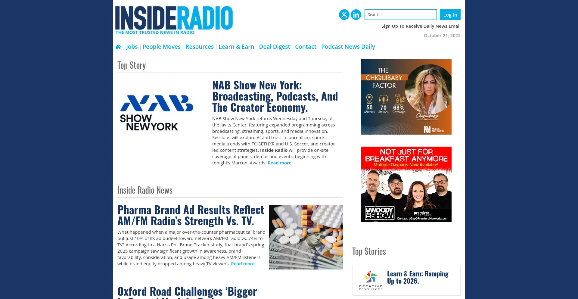 网站上存在社交媒体链接表明 insideradio.com 在社交媒体上维护官方账户,这是可信度和参与度的积极信号。