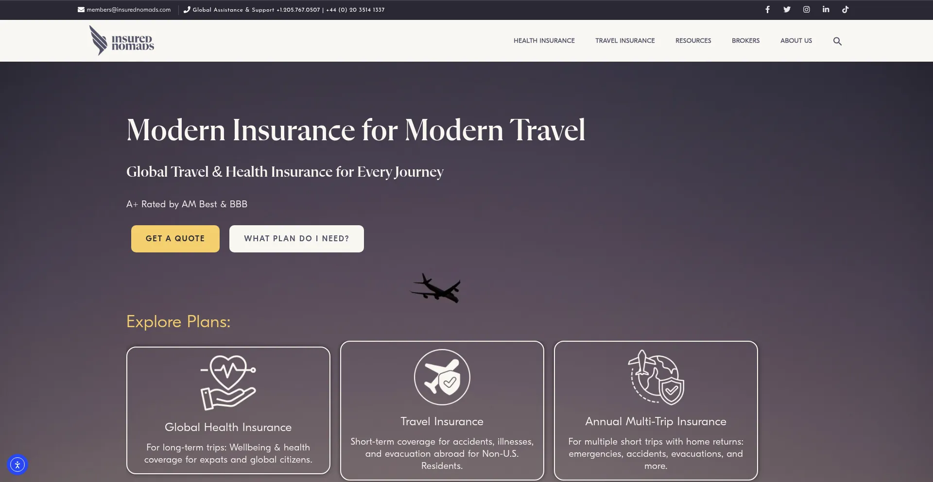 网站上存在社交媒体链接表明 insurednomads.com 在社交媒体上维护官方账户,这是可信度和参与度的积极信号。