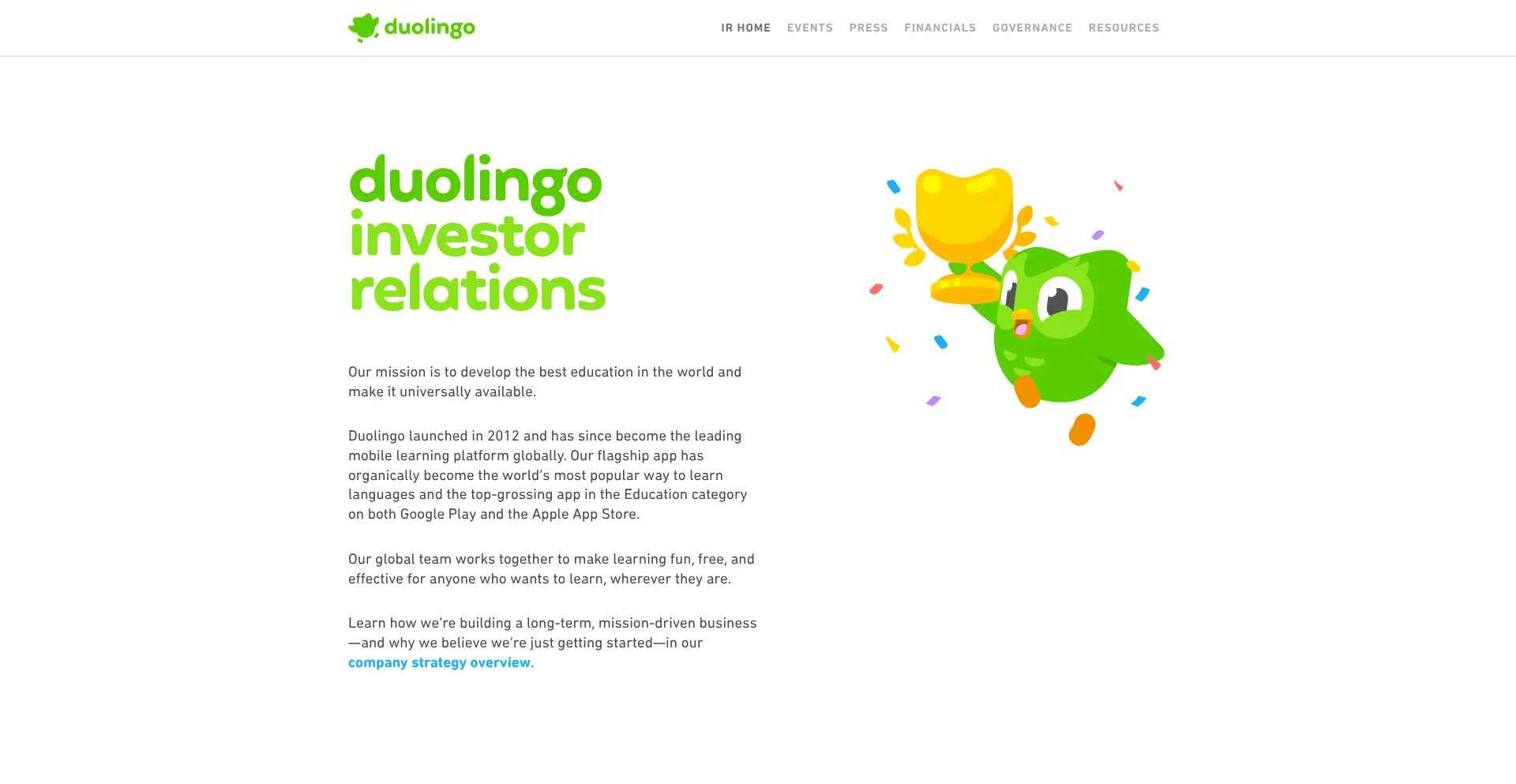 The Investor Relations website contains information about Duolingo, Inc.'s business for stockholders, potential investors, and financial analysts.
