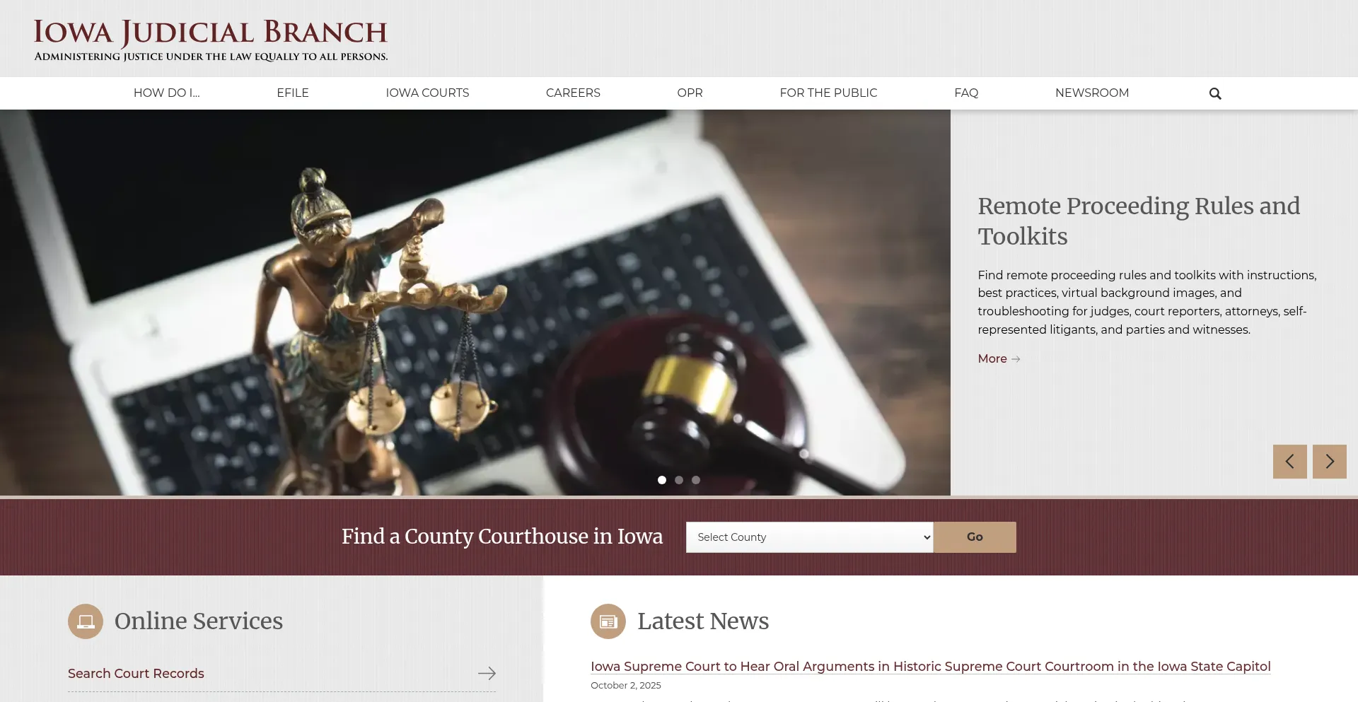 The Iowa Judicial Branch dedicates itself to providing independent and accessible forums for the fair and prompt resolutions of disputes, administering justice under law equally...