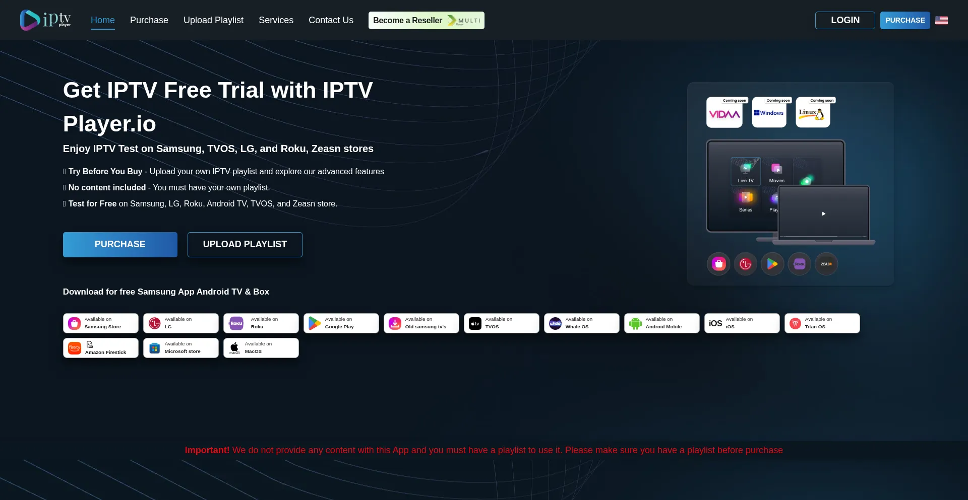 Run an IPTV test or start a free IPTV trial with your own playlist. No content included. Available on Samsung, LG, Roku, Android, and more.