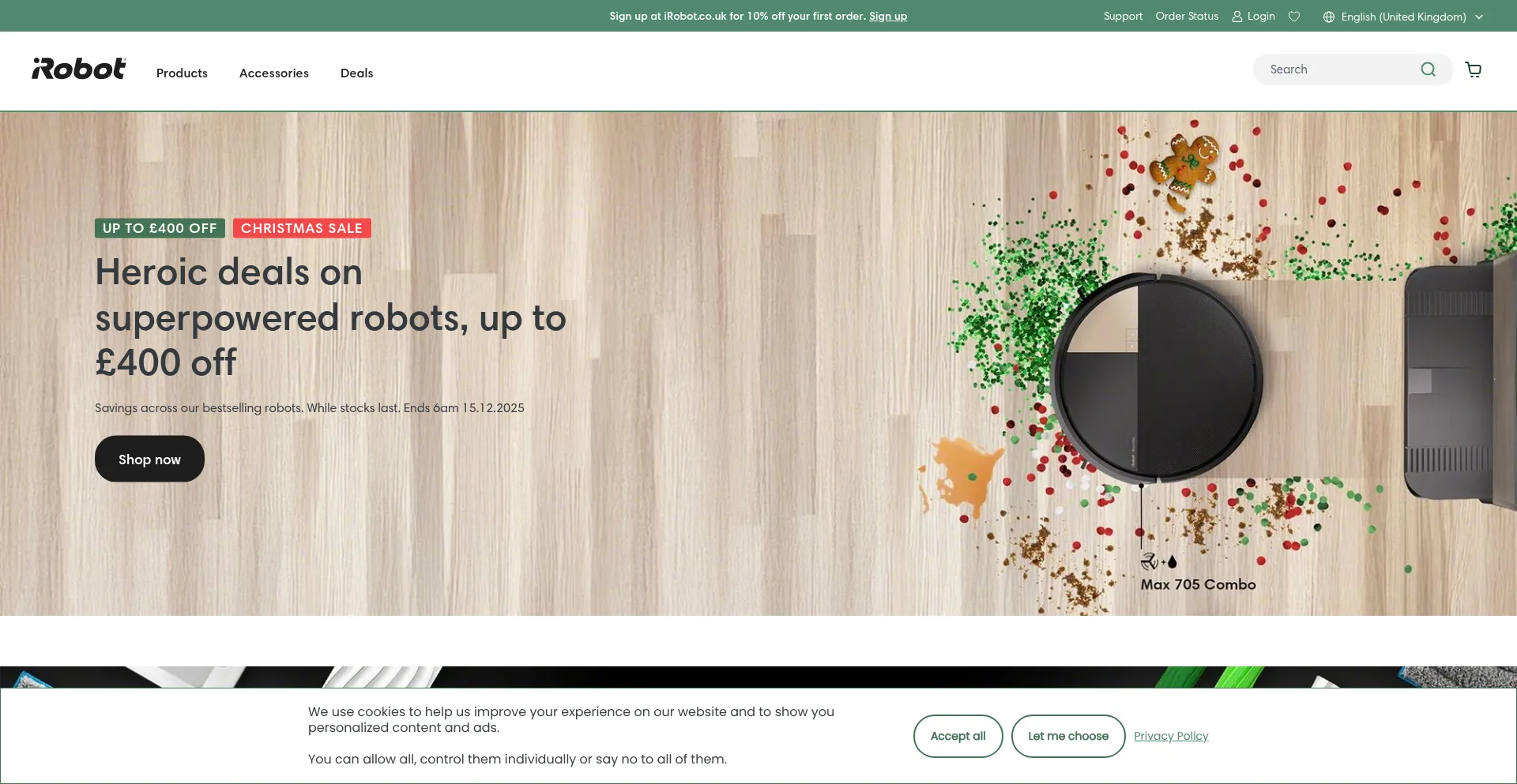 该网站实现符合GDPR或CCPA等隐私法规的cookie同意机制。这表明 irobot.co.uk 遵守数据保护标准并为用户提供对个人数据收集实践的控制。
