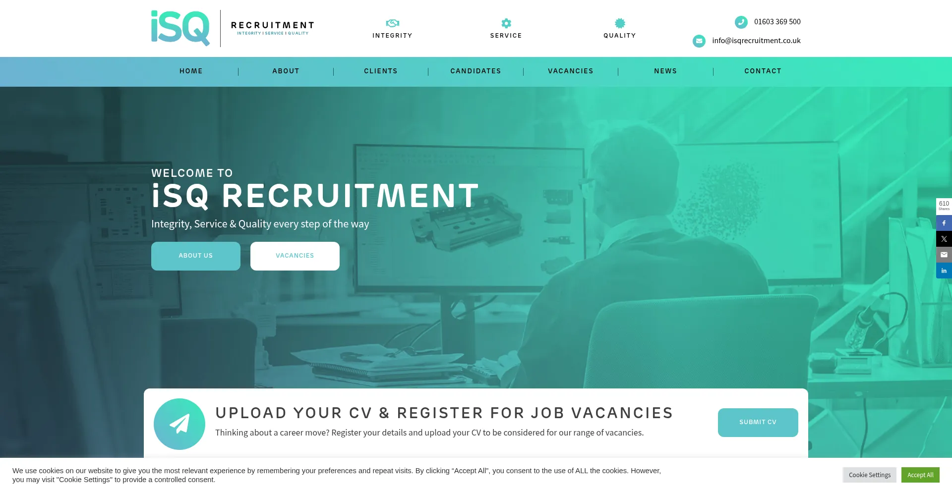 网站上存在社交媒体链接表明 isqrecruitment.co.uk 在社交媒体上维护官方账户,这是可信度和参与度的积极信号。