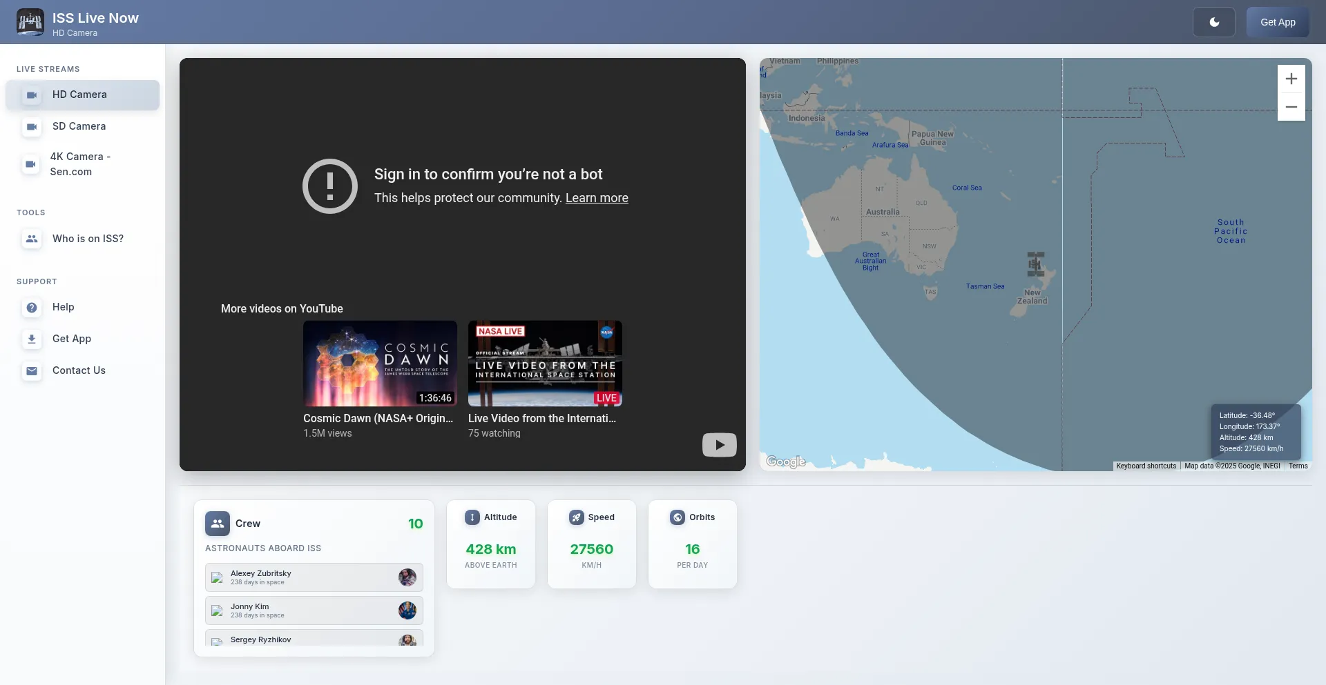 Watch live HD video from the International Space Station. Real-time ISS tracking, crew information, and space exploration updates.