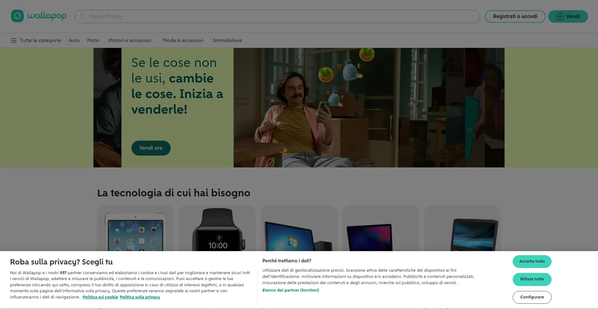 该网站实现符合GDPR或CCPA等隐私法规的cookie同意机制。这表明 it.wallapop.com 遵守数据保护标准并为用户提供对个人数据收集实践的控制。