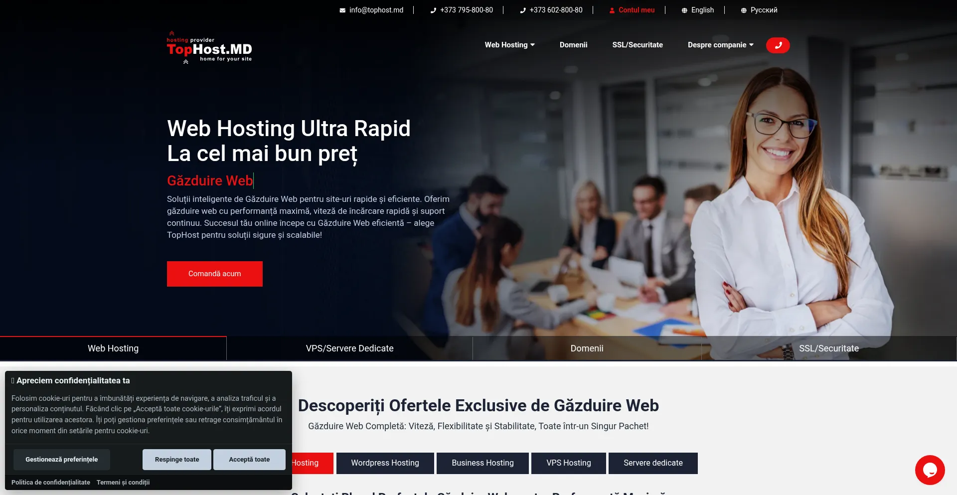 TopHost oferă soluții de Găzduire Web de încredere în Moldova, inclusiv WordPress Hosting, Servere VPS, Servere Dedicate și Certificate SSL. Beneficiați de suport 24/7 ș...