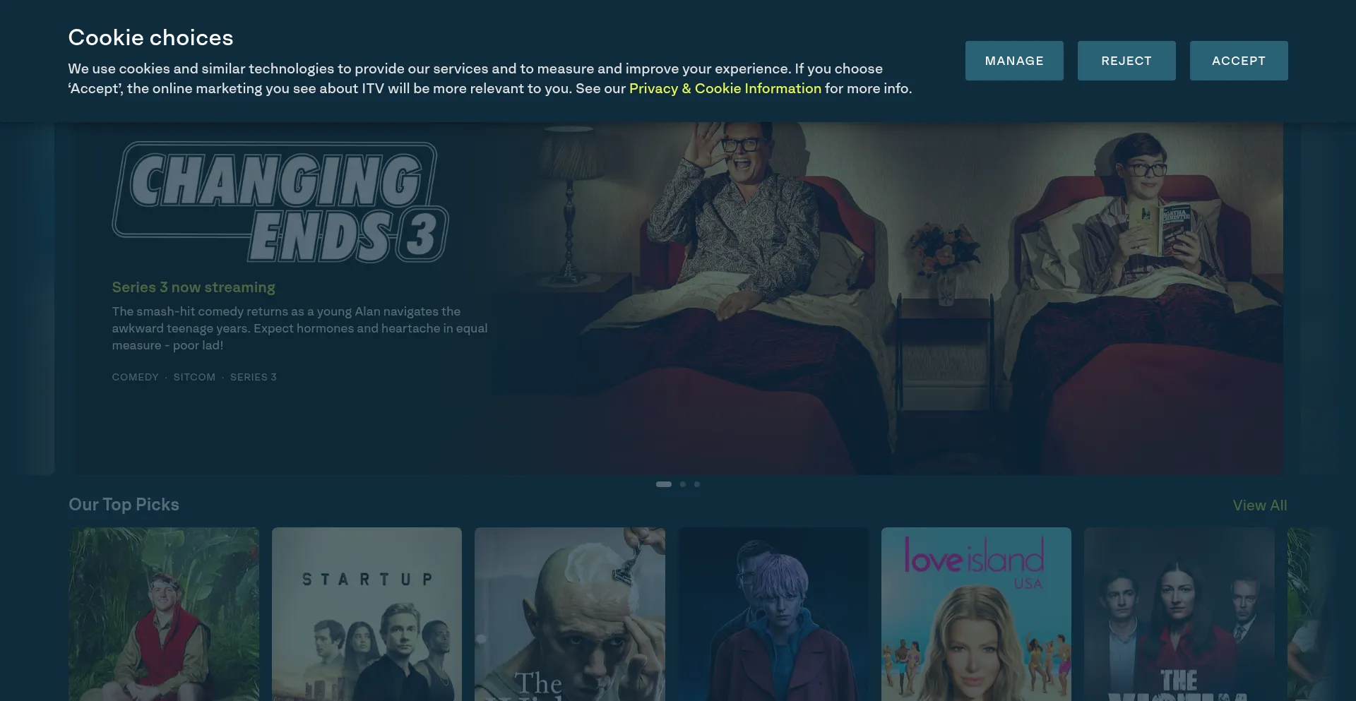 该网站实现符合GDPR或CCPA等隐私法规的cookie同意机制。这表明 itv.com 遵守数据保护标准并为用户提供对个人数据收集实践的控制。