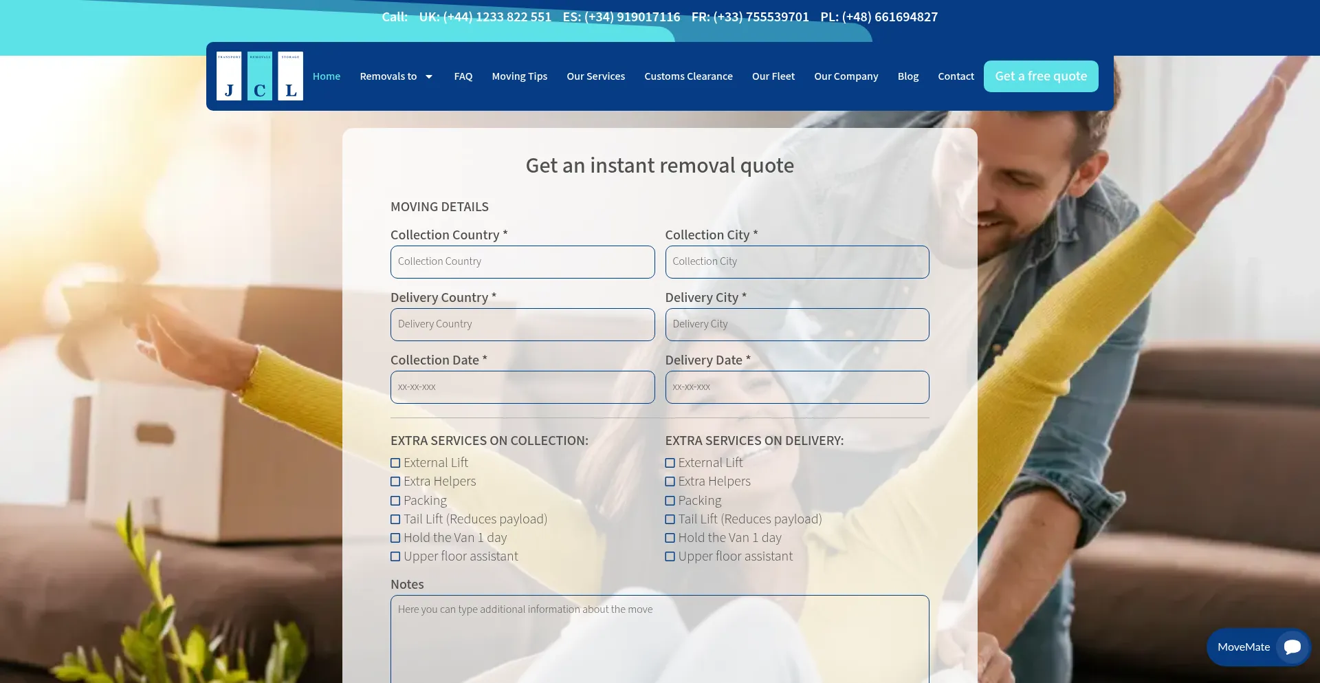 该网站实现数据收集表单,请求个人信息,包括姓名、电子邮件地址、电话号码或其他敏感详细信息。用户应验证 jcltransport.com 的合法性并在提交个人数据前查看隐私政策。