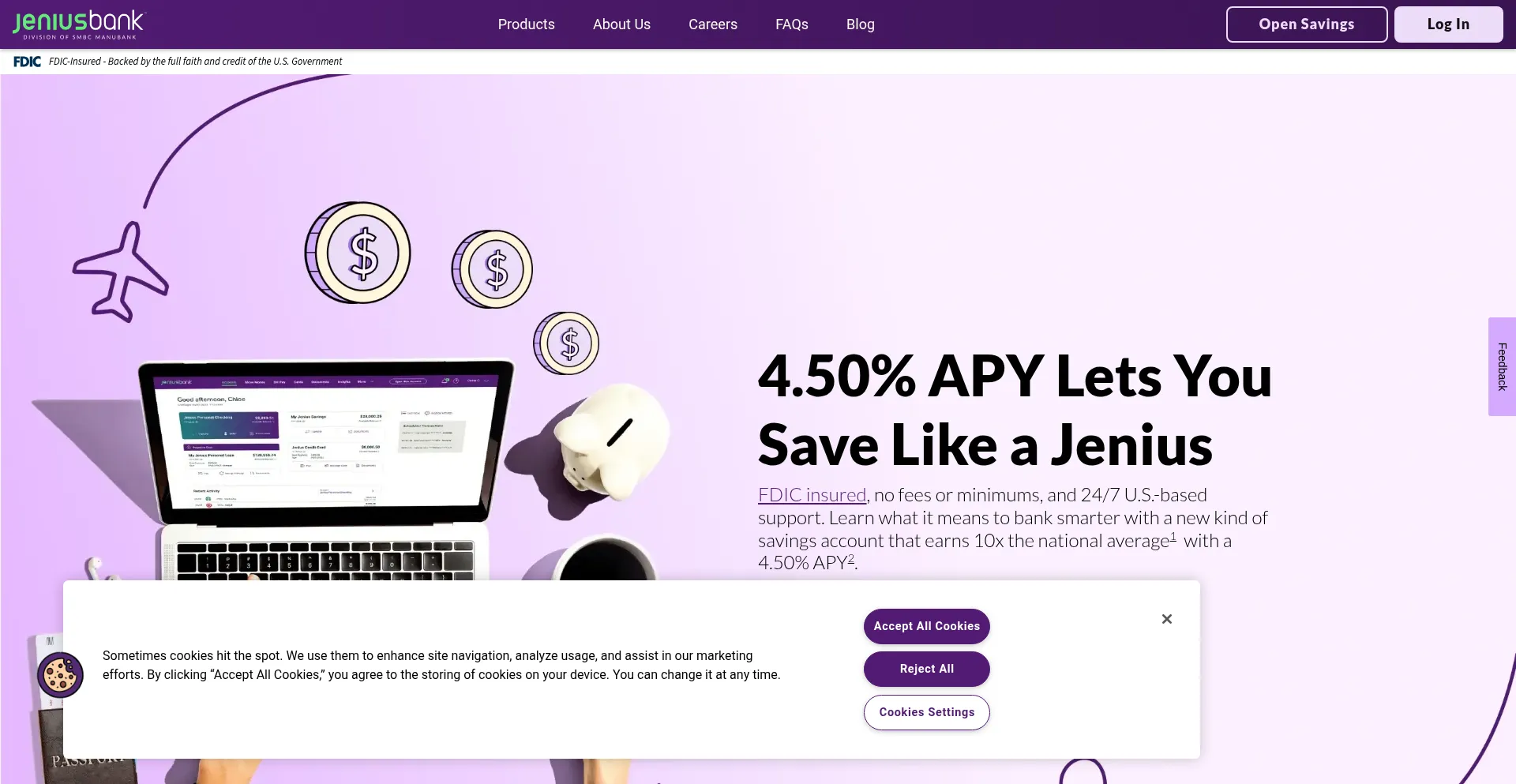 该网站实现符合GDPR或CCPA等隐私法规的cookie同意机制。这表明 jeniusbank.com 遵守数据保护标准并为用户提供对个人数据收集实践的控制。