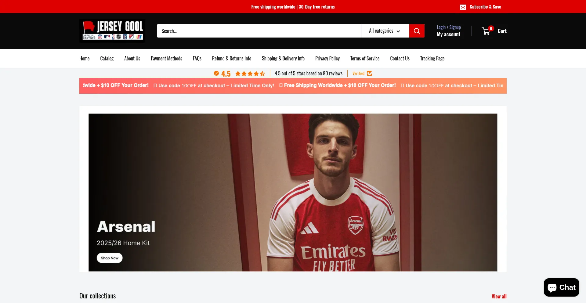 我们的分析器确定网站 jerseygool.com 使用的是 Shopify CMS。Shopify 是一个流行的电子商务平台,全球约有 4.4% 的网站使用 Shopify。Shopify 通常确保购物体验的安全性,但访问者应小心某些第三方集成,因其若未经适当验证,可能会带来安全风险。