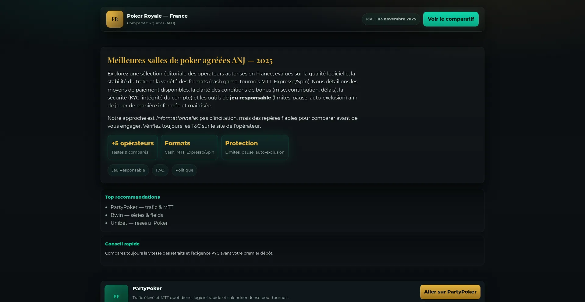 Guide premium et indépendant des salles de poker en ligne agréées ANJ en France : trafic, formats (cash, MTT, Expresso/Spin), paiements, sécurité, KYC et outils de jeu resp...
