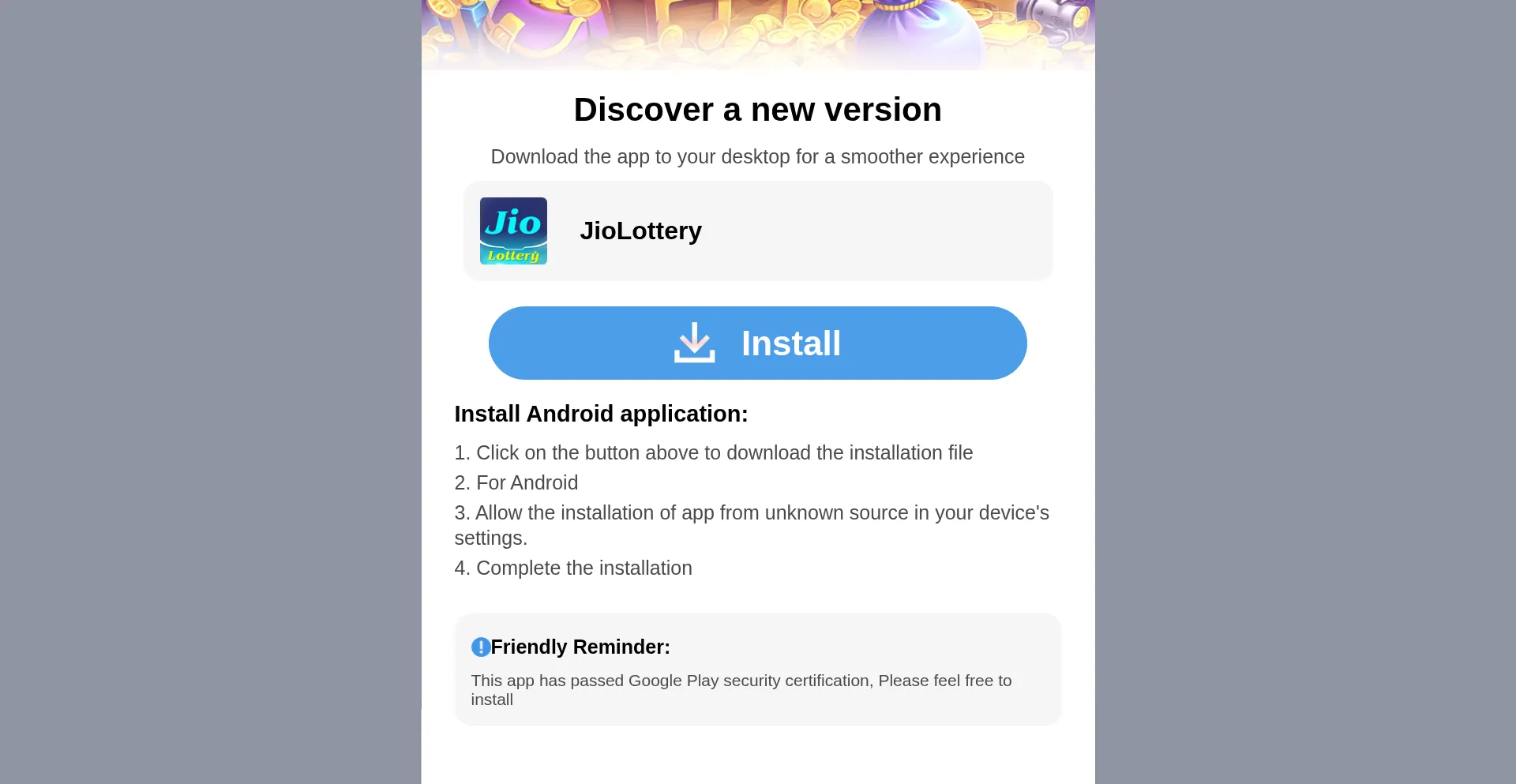 网站 jiolotteryygfb.cc 被配置为一个带有移动应用功能的网络应用。用户可以直接将该网站安装到设备的桌面上,以快速访问并享受类似移动应用的体验。