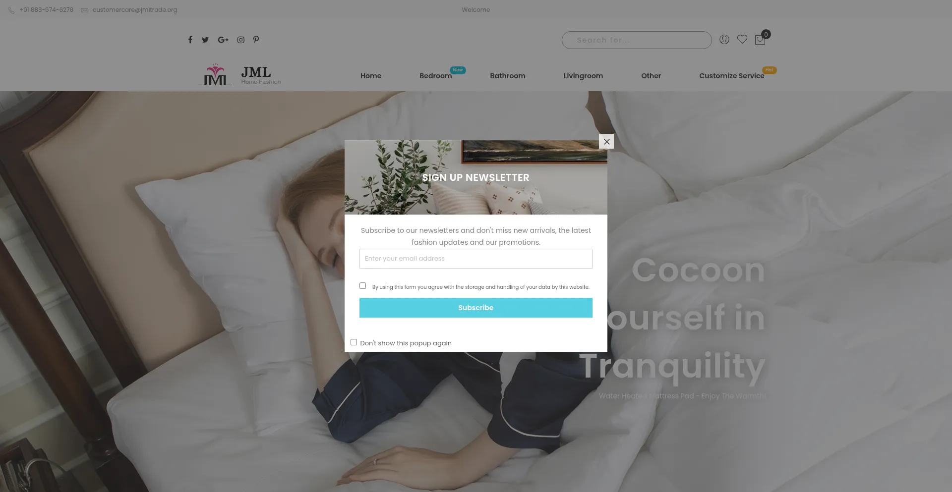 该网站实现数据收集表单,请求个人信息,包括姓名、电子邮件地址、电话号码或其他敏感详细信息。用户应验证 jmlhomefashion.com 的合法性并在提交个人数据前查看隐私政策。