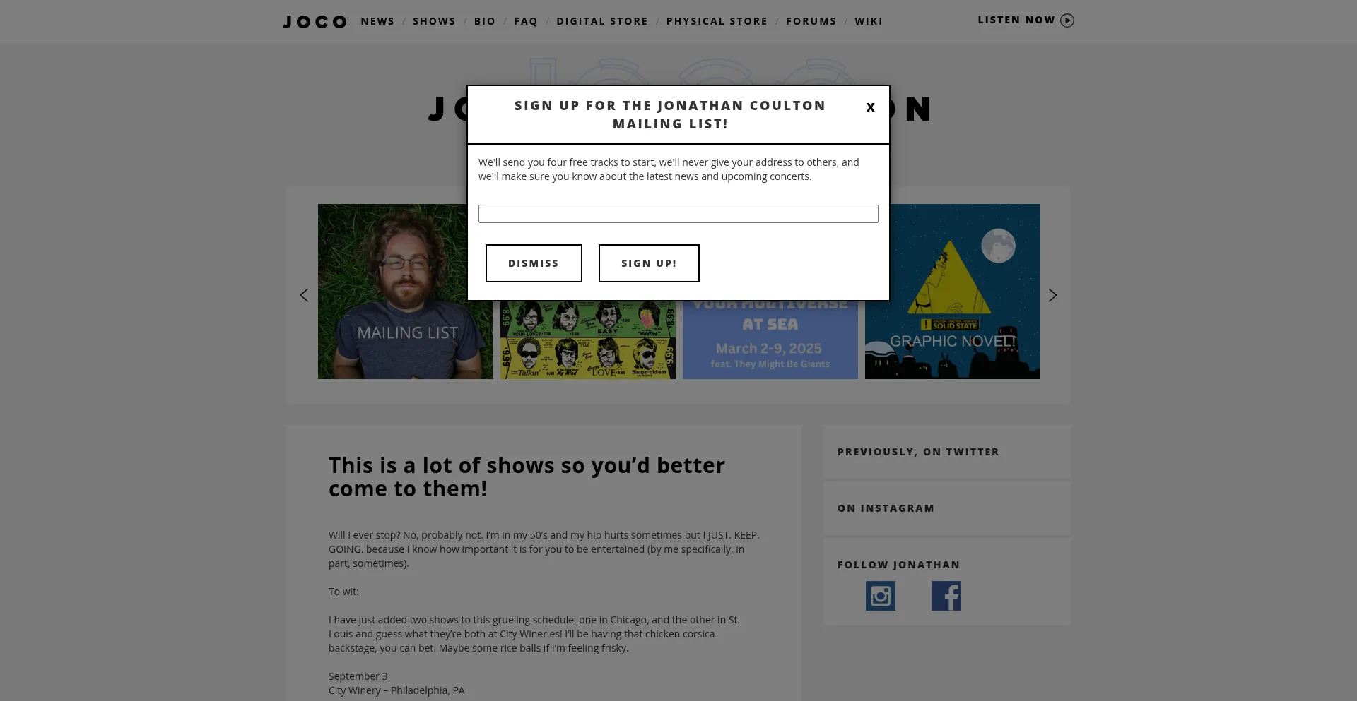 该网站实现数据收集表单,请求个人信息,包括姓名、电子邮件地址、电话号码或其他敏感详细信息。用户应验证 jonathancoulton.com 的合法性并在提交个人数据前查看隐私政策。