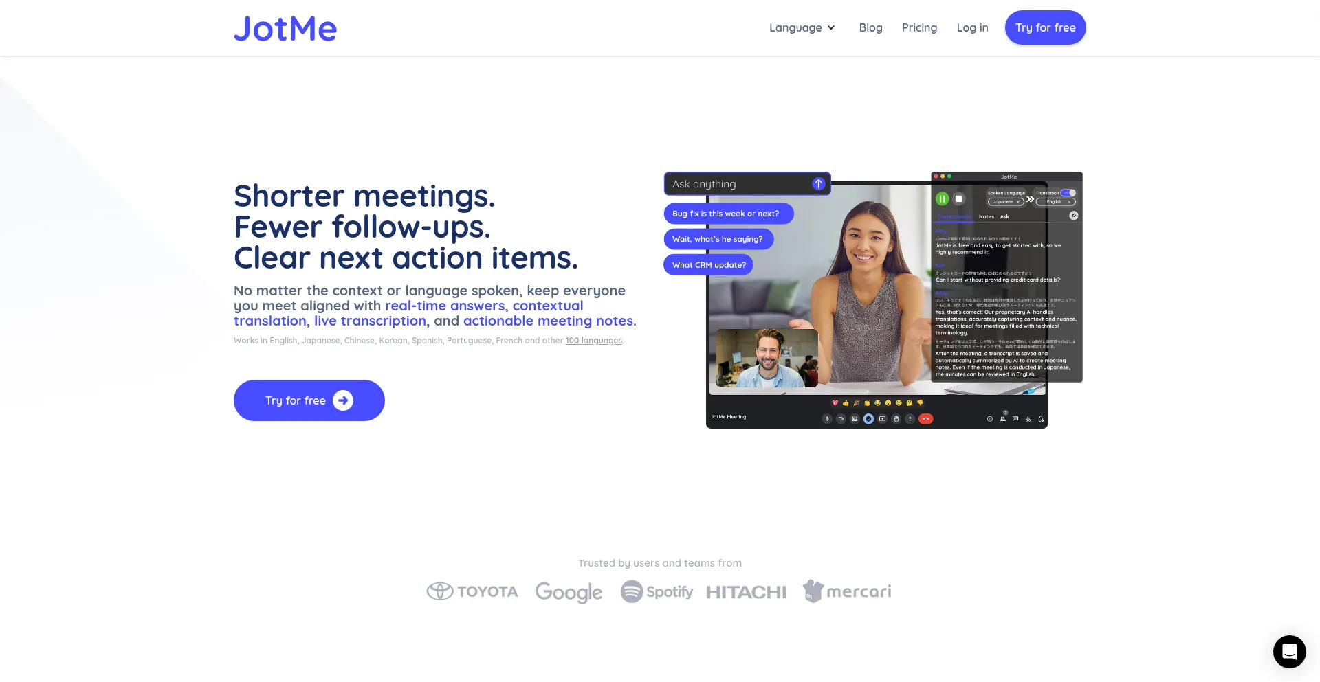 JotMe is like having someone smart next to you during meetings, answering questions, translating contextually, and capturing your thoughts in real time. It supports 107 language...