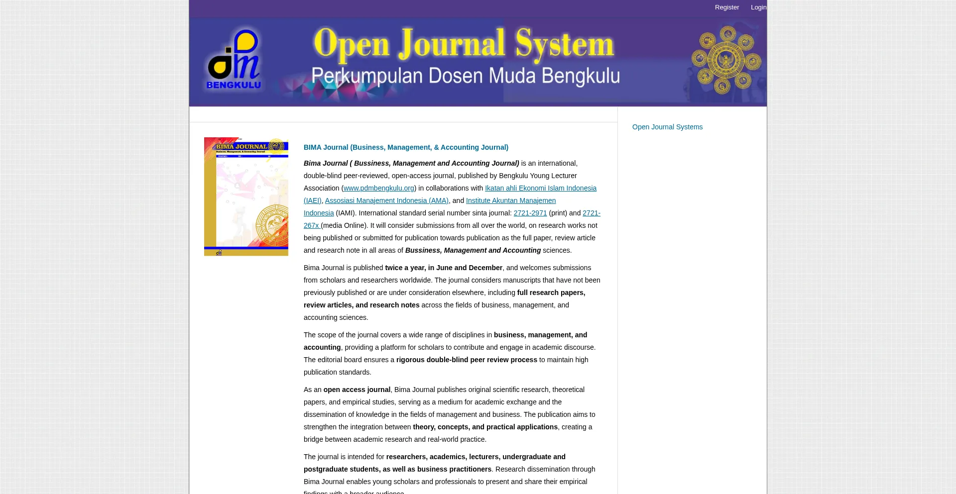 Bima Journal ( Bussiness, Management and Accounting Journal) is an international, double-blind peer-reviewed, open-access journal, published by Bengkulu Young Lecturer Associat...