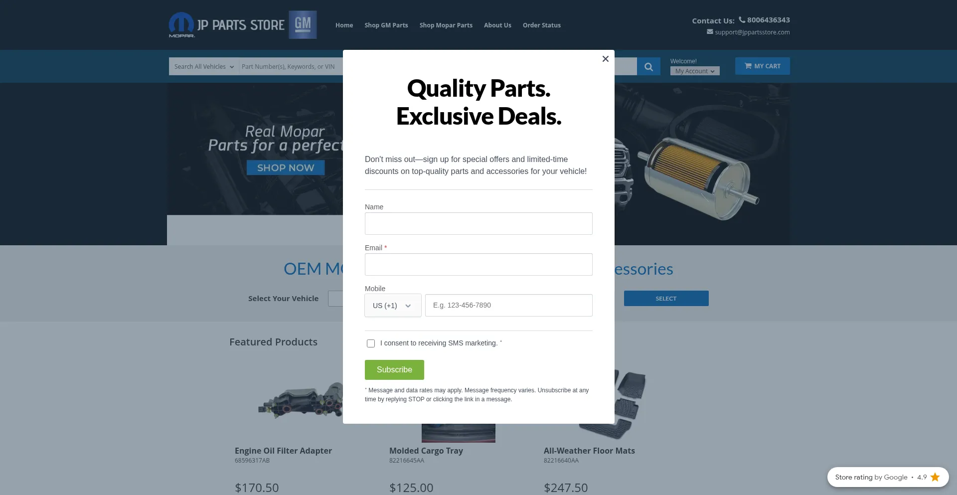该网站实现数据收集表单,请求个人信息,包括姓名、电子邮件地址、电话号码或其他敏感详细信息。用户应验证 jppartsstore.com 的合法性并在提交个人数据前查看隐私政策。