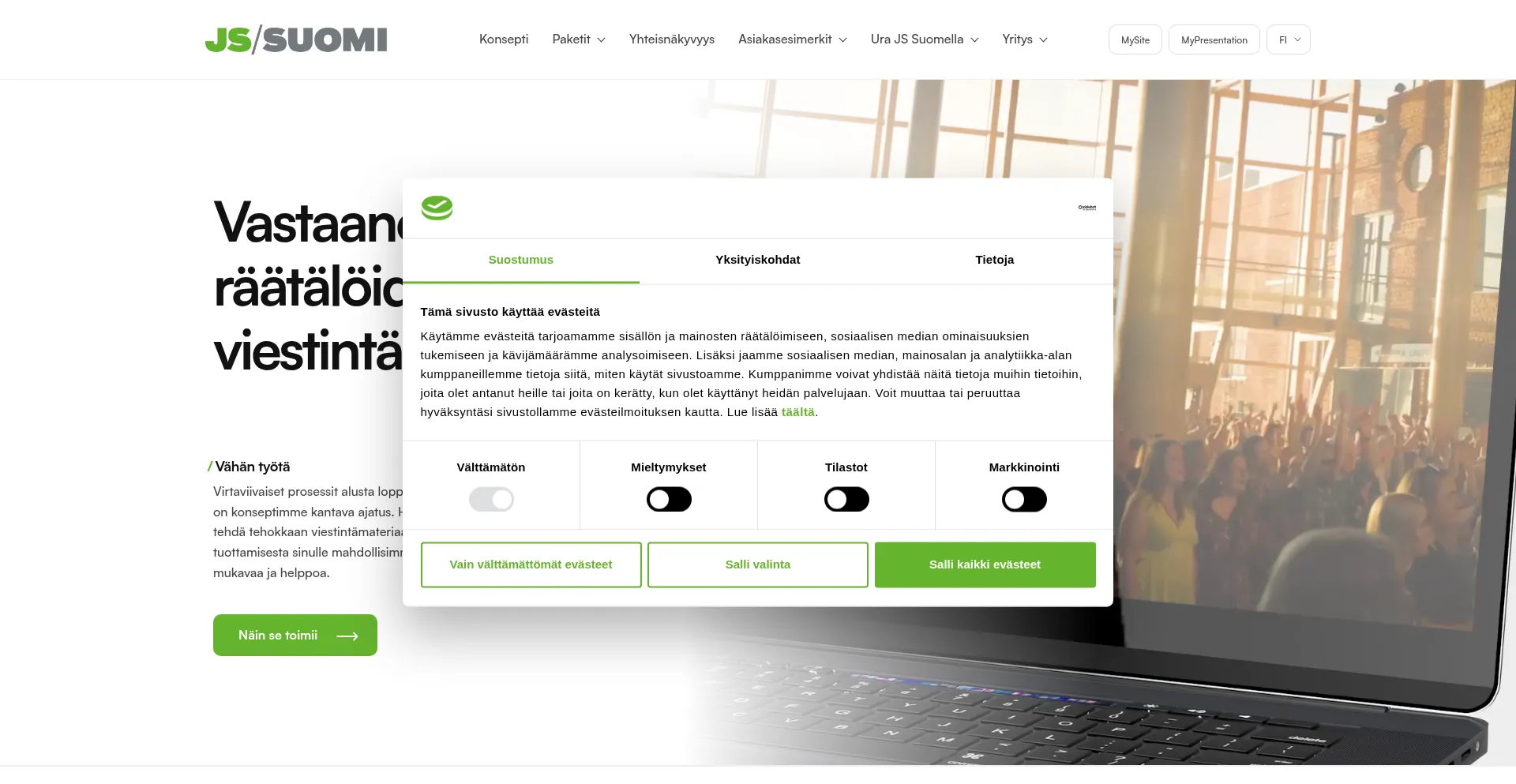 该网站实现符合GDPR或CCPA等隐私法规的cookie同意机制。这表明 jssuomi.fi 遵守数据保护标准并为用户提供对个人数据收集实践的控制。