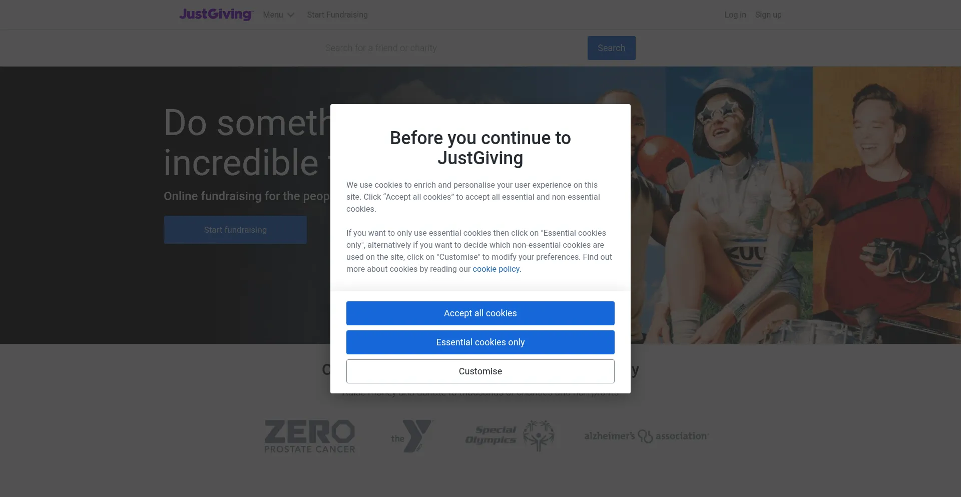 该网站实现符合GDPR或CCPA等隐私法规的cookie同意机制。这表明 justgiving.com 遵守数据保护标准并为用户提供对个人数据收集实践的控制。