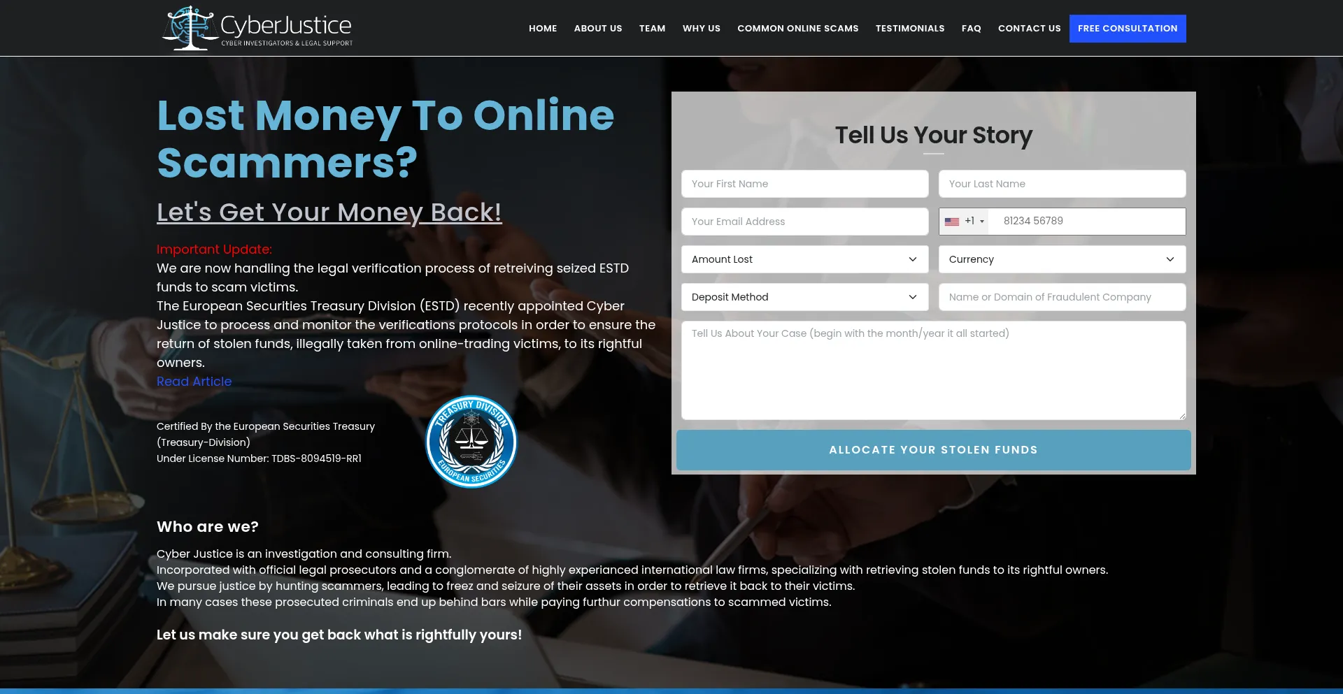 网站 justicelawltd.com 宣传针对丢失或被盗资产的资金恢复服务。虽然一些在应急费用结构上运营,其他可能需要预付款,这可能表明欺诈运营。在聘请此类服务前验证凭据和监管合规性。