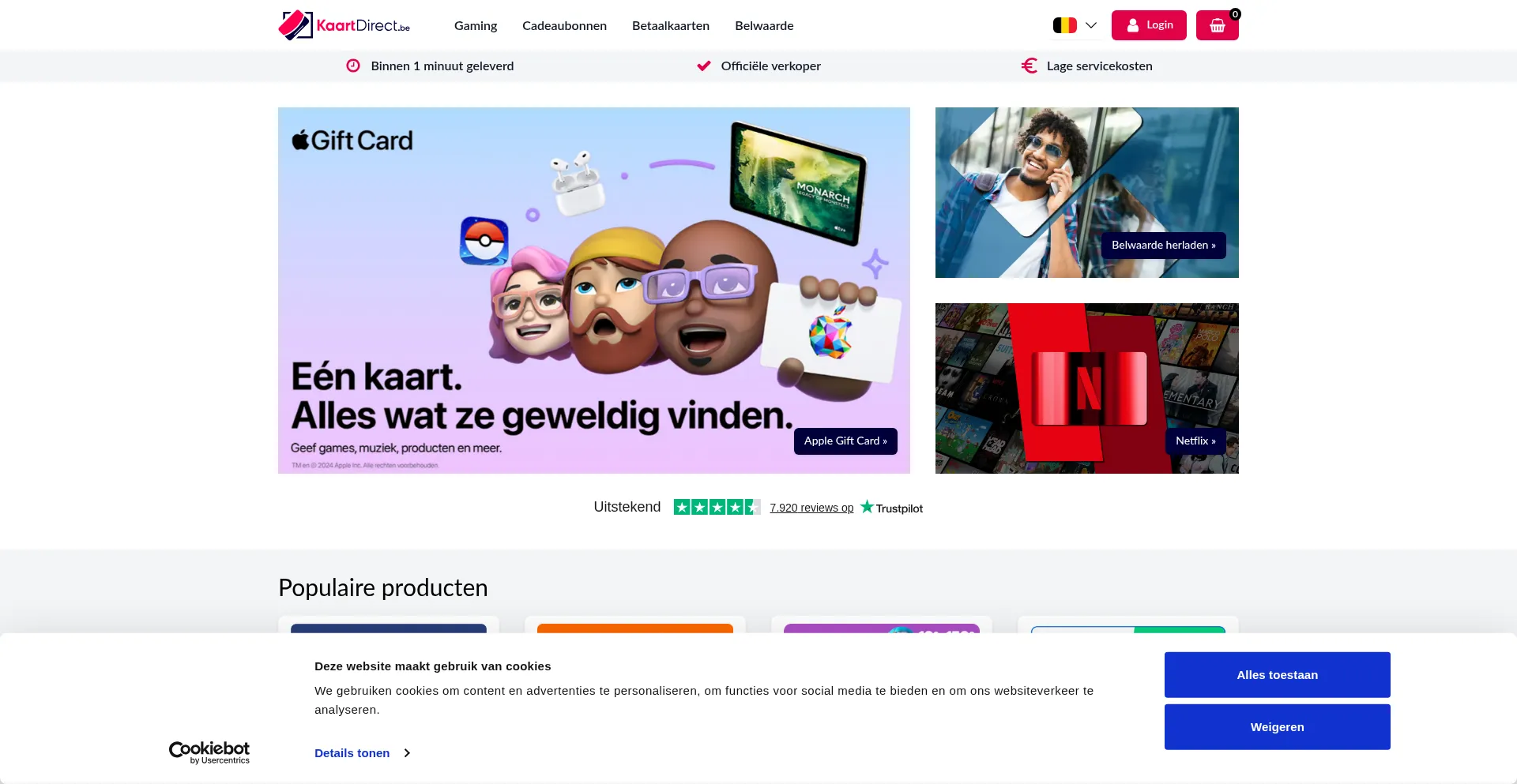 Cadeaubonnen, tegoedkaarten voor games, of het herladen van je simkaart: ga nu naar KaartDirect.be! Je ontvangt de code direct per mail, veilig en snel.
