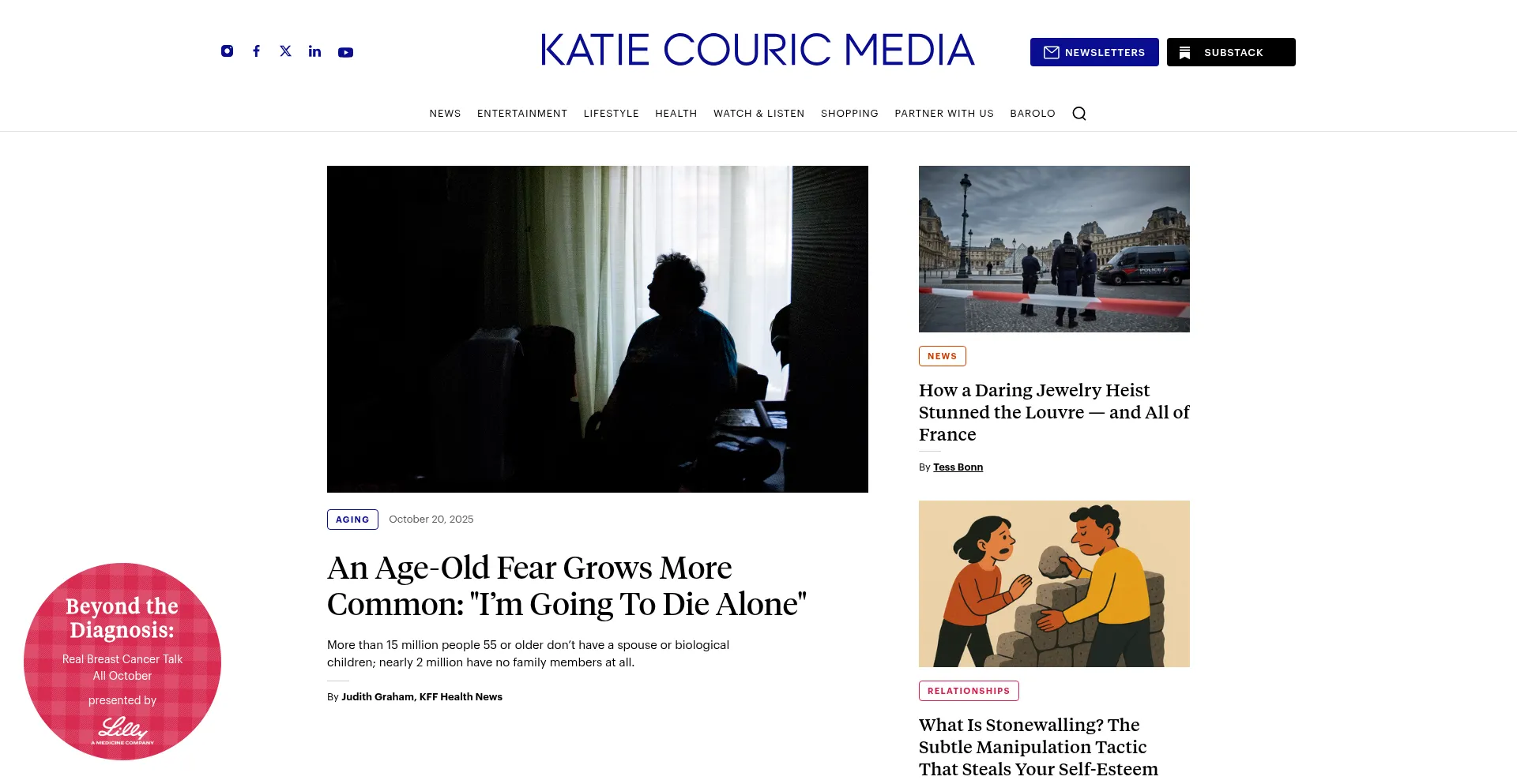 网站上存在社交媒体链接表明 katiecouric.com 在社交媒体上维护官方账户,这是可信度和参与度的积极信号。