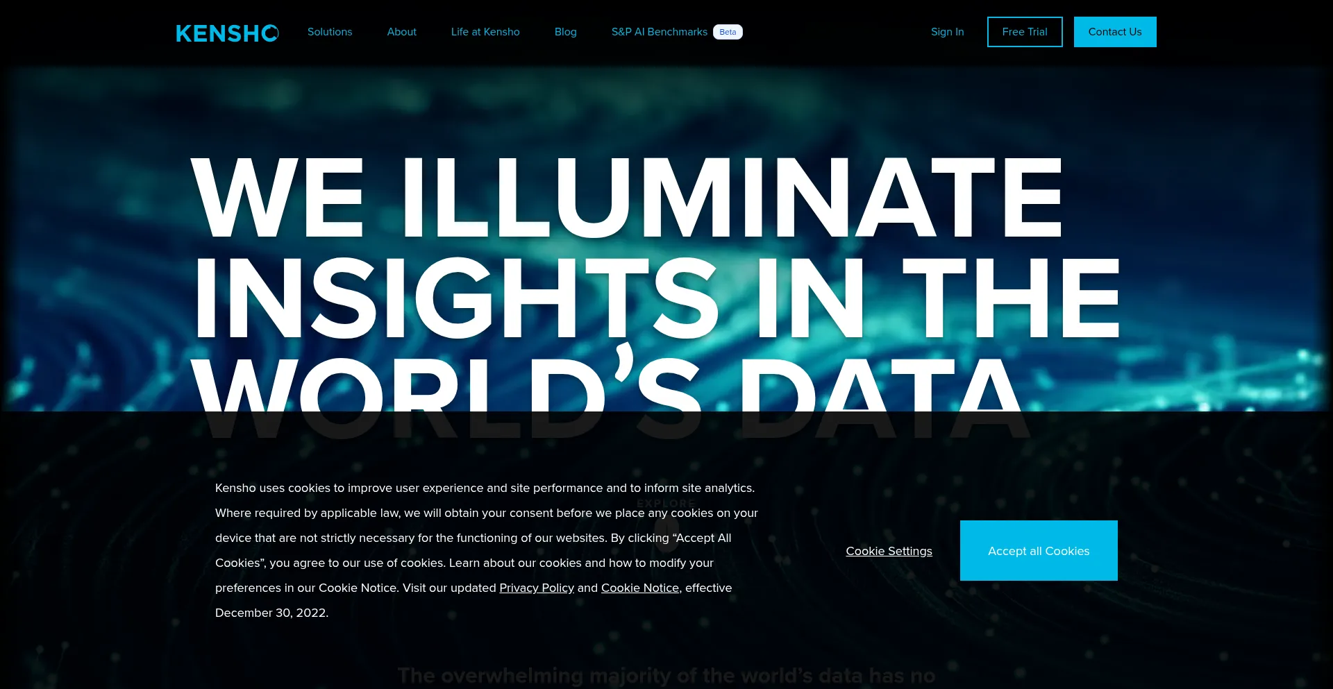 该网站实现符合GDPR或CCPA等隐私法规的cookie同意机制。这表明 kensho.com 遵守数据保护标准并为用户提供对个人数据收集实践的控制。