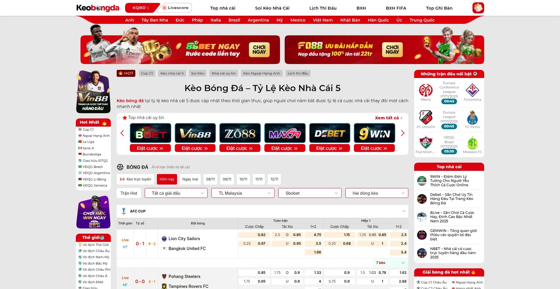 Kèo bóng đá, tỷ lệ kèo nhà cái 5 cập nhật trực tuyến liên tục, đầy đủ nhanh nhất, tỷ lệ cá cược, kết quả bóng đá theo thời gian th...