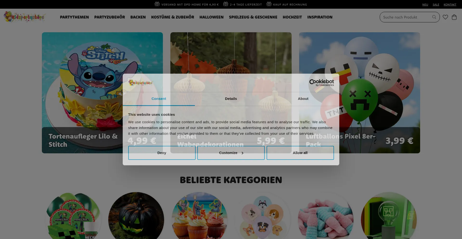 该网站实现符合GDPR或CCPA等隐私法规的cookie同意机制。这表明 kidspartystore.de 遵守数据保护标准并为用户提供对个人数据收集实践的控制。