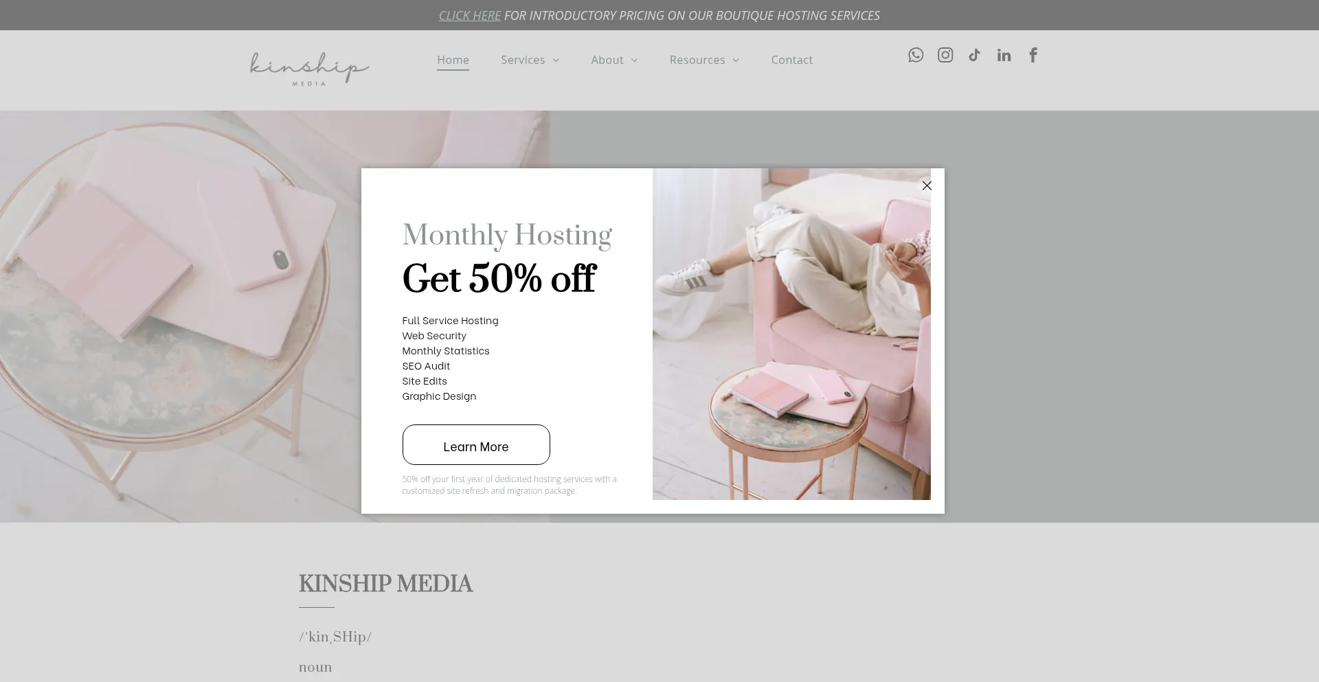 网站上存在社交媒体链接表明 kinship-media.com 在社交媒体上维护官方账户,这是可信度和参与度的积极信号。