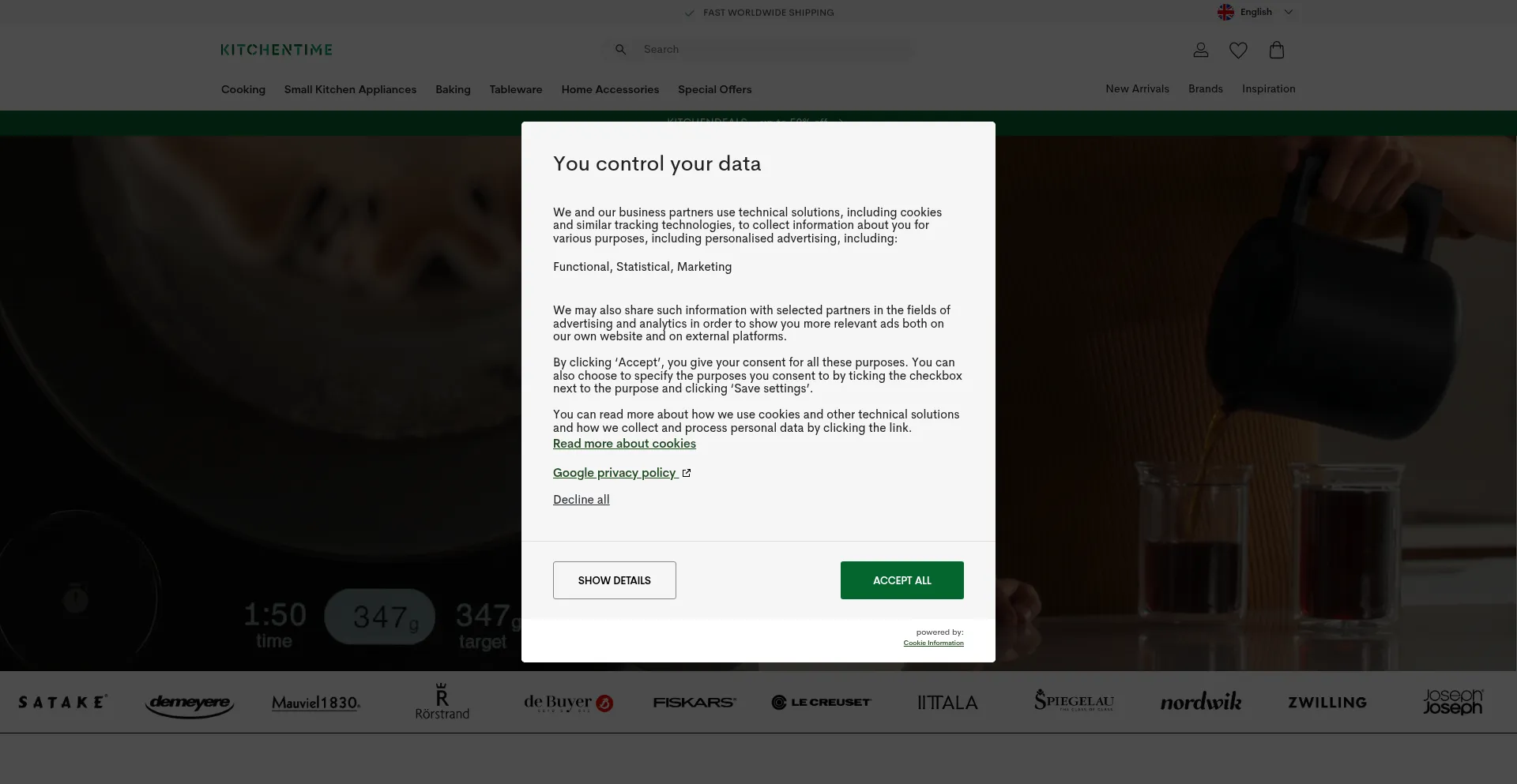 该网站实现符合GDPR或CCPA等隐私法规的cookie同意机制。这表明 kitchentime.com 遵守数据保护标准并为用户提供对个人数据收集实践的控制。