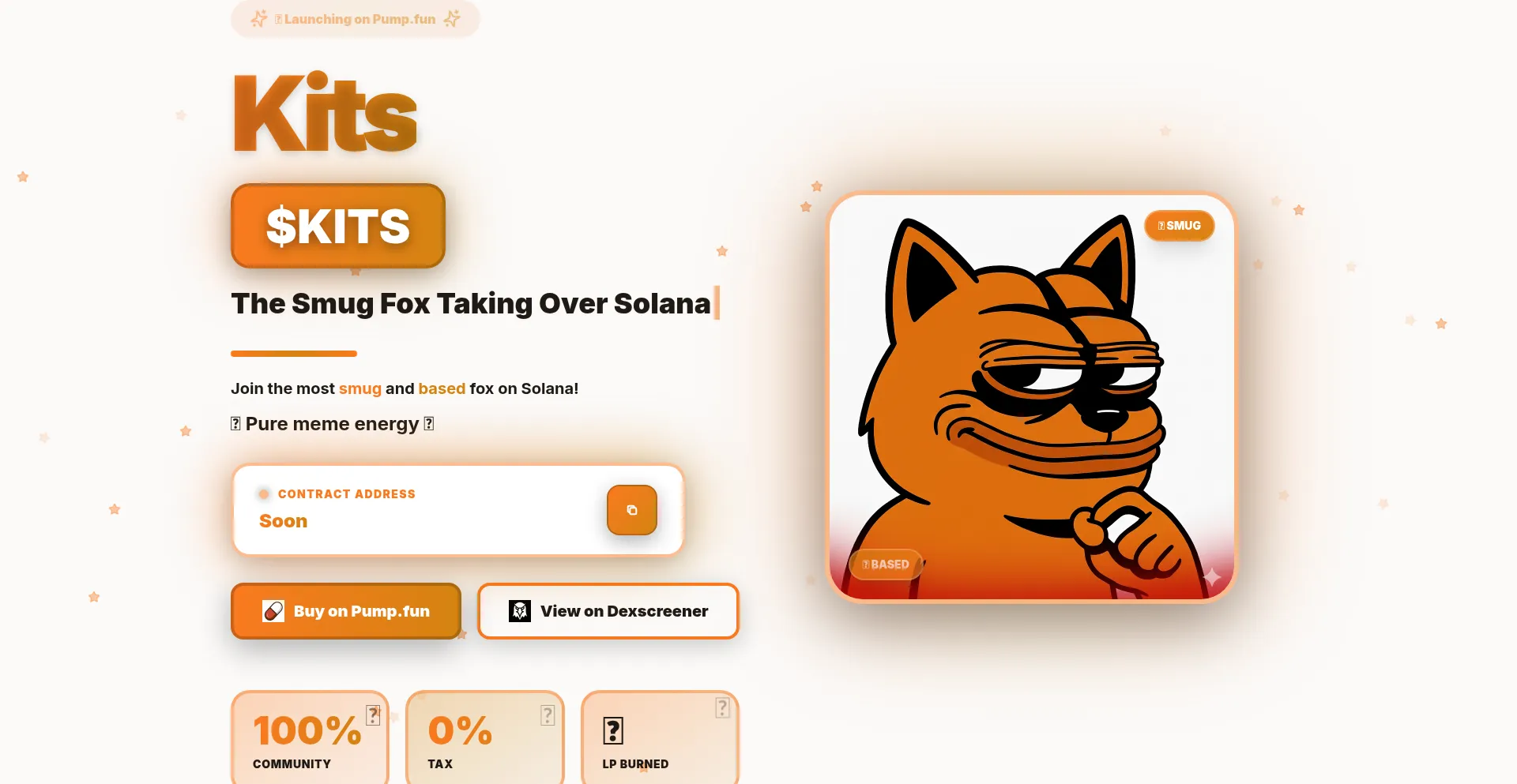 Meet $KITS - Kits, the smuggest fox on Solana! 100% community-driven meme coin, 0% tax, LP burned. Pure meme energy and based fox vibes. Join the pack!