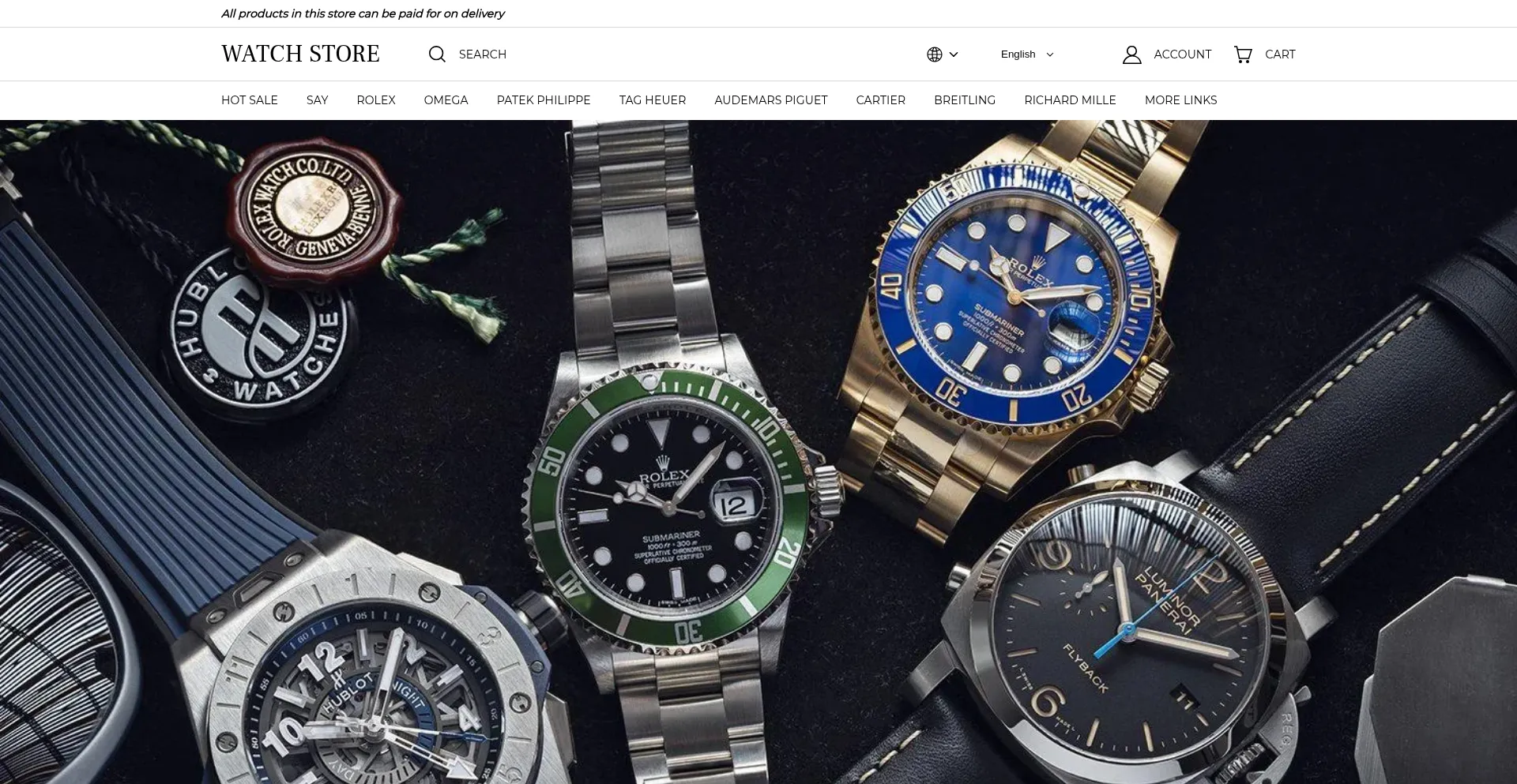 该网站展示奢侈品牌名称或高价值产品。这可能表明潜在的假冒商品或未经授权的品牌使用,特别是如果该网站缺乏官方经销商授权。在评估真实性时请格外谨慎。