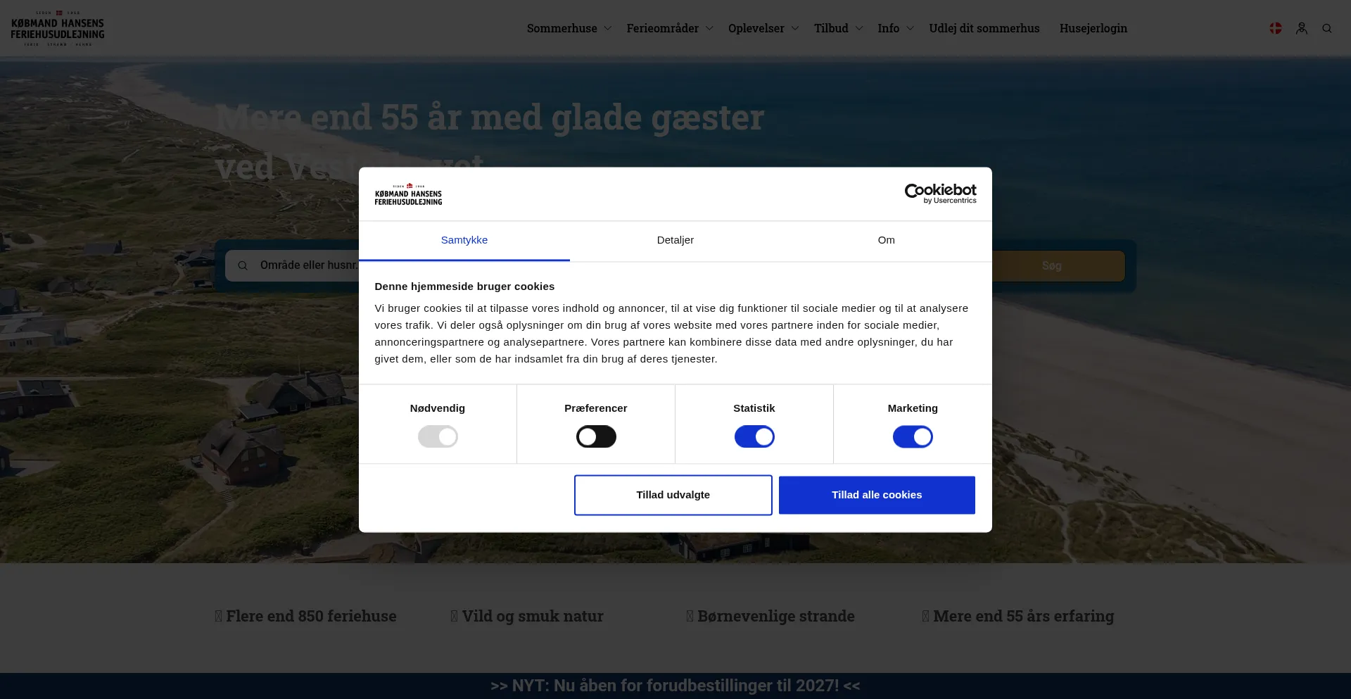 Vælg mellem +850 sommerhuse ved vestkysten i Danmark. Købmand Hansens Feriehusudlejning har et stort udvalg af sommerhuse i Henne Strand, Houstrup og omegn.