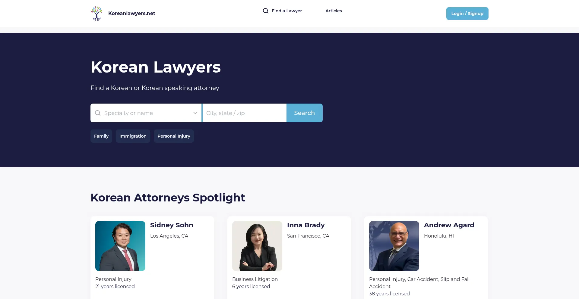 Find a top Korean lawyer or attorney near me. All Korean lawyers and attorneys are encouraged to publish their free listings.