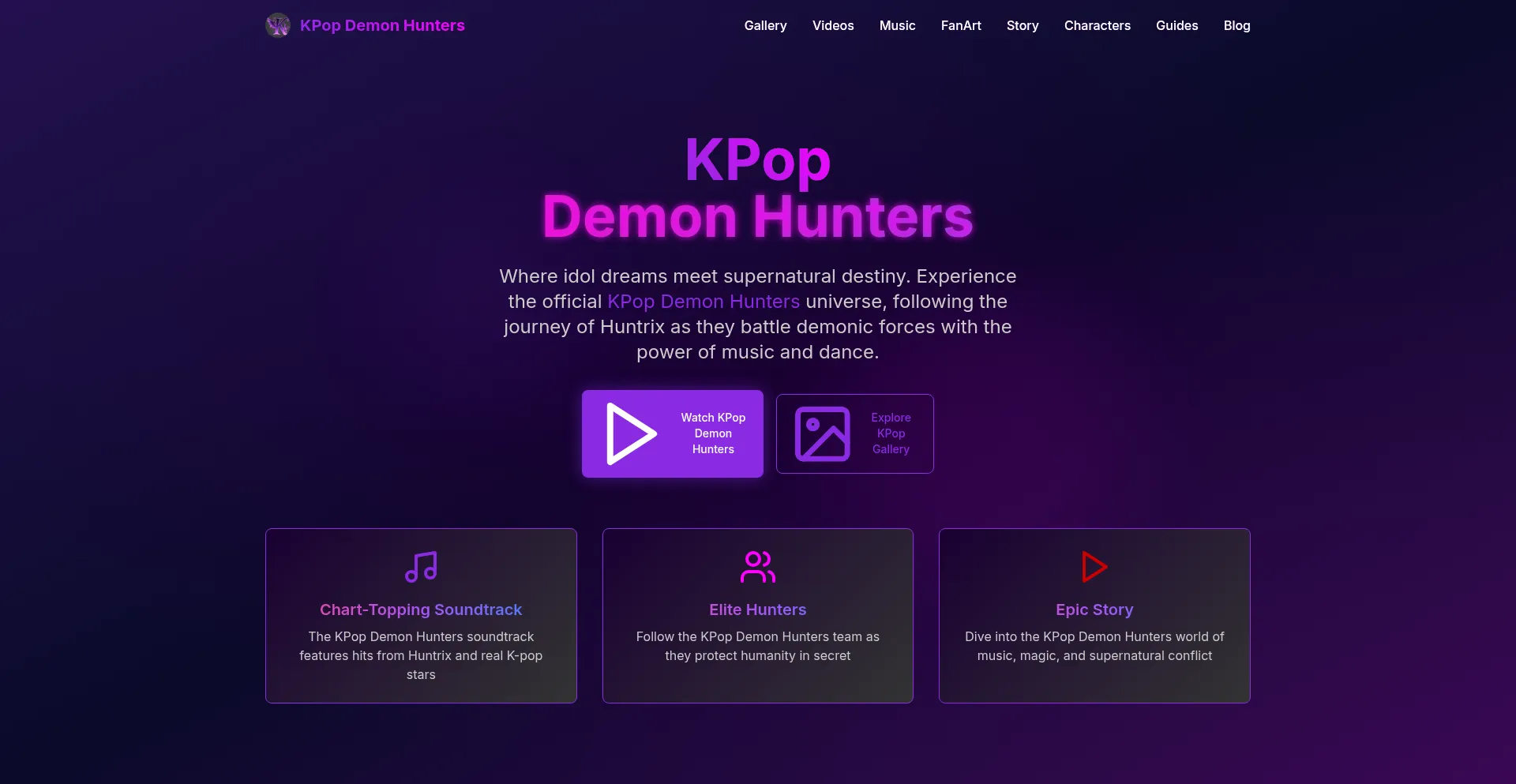KPop Demon Hunters Fan Hub - explore Huntrix & Saja Boys characters, songs, gallery & fan community. Netflix's 2025 animated K-pop sensation with 97% RT score.