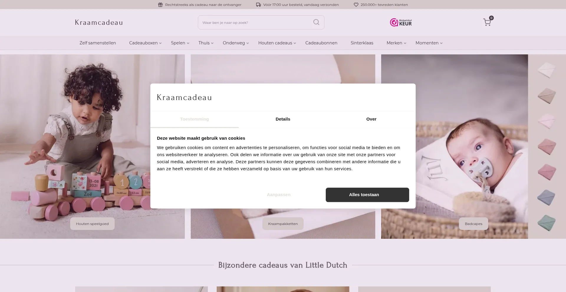 该网站实现符合GDPR或CCPA等隐私法规的cookie同意机制。这表明 kraam-cadeau.nl 遵守数据保护标准并为用户提供对个人数据收集实践的控制。