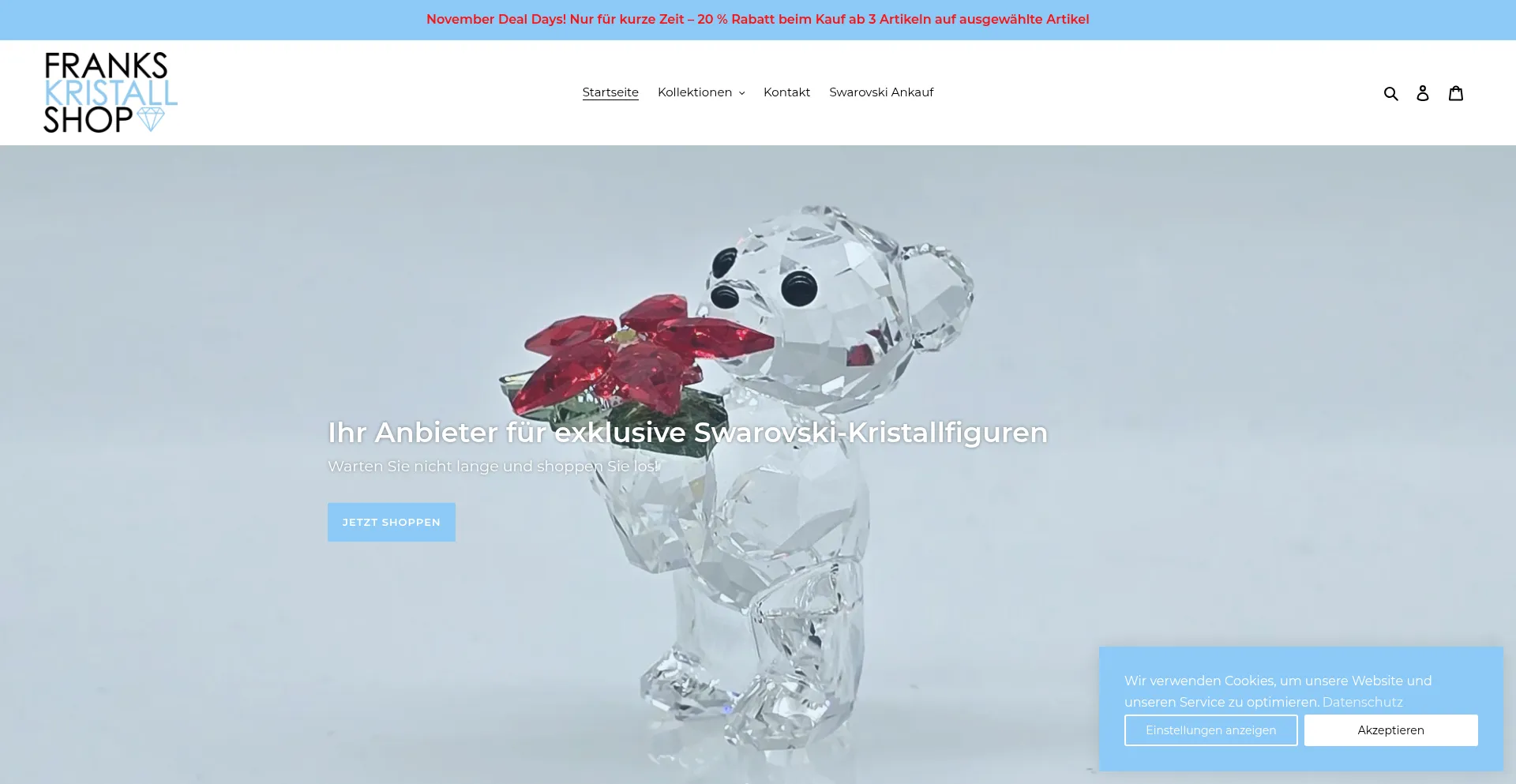 Willkommen bei Franks Kristall Shop. Ihr Anbieter für exklusive Swarovski Kristallfiguren. Warten Sie nicht lange und shoppen Sie los!